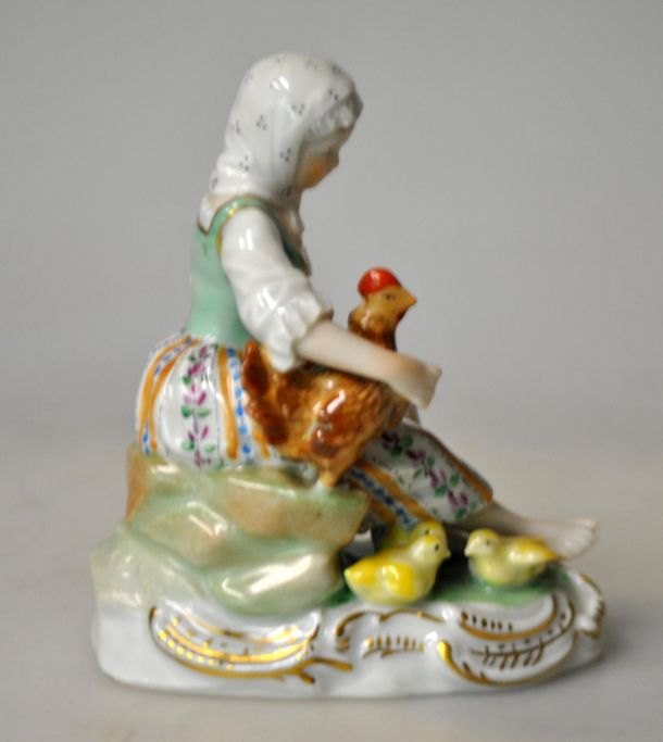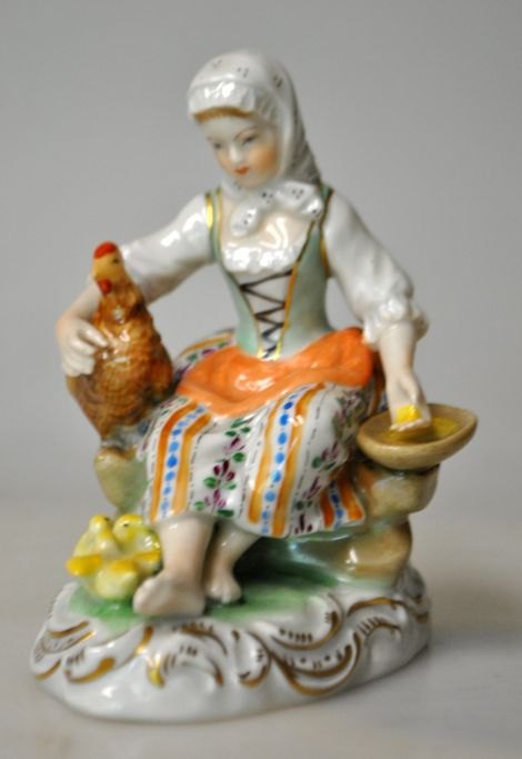 Porcelain figure of peasant girl with chickens, Potschappel, Dresden, Germany. 20th century