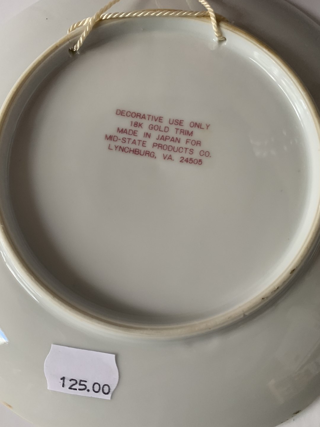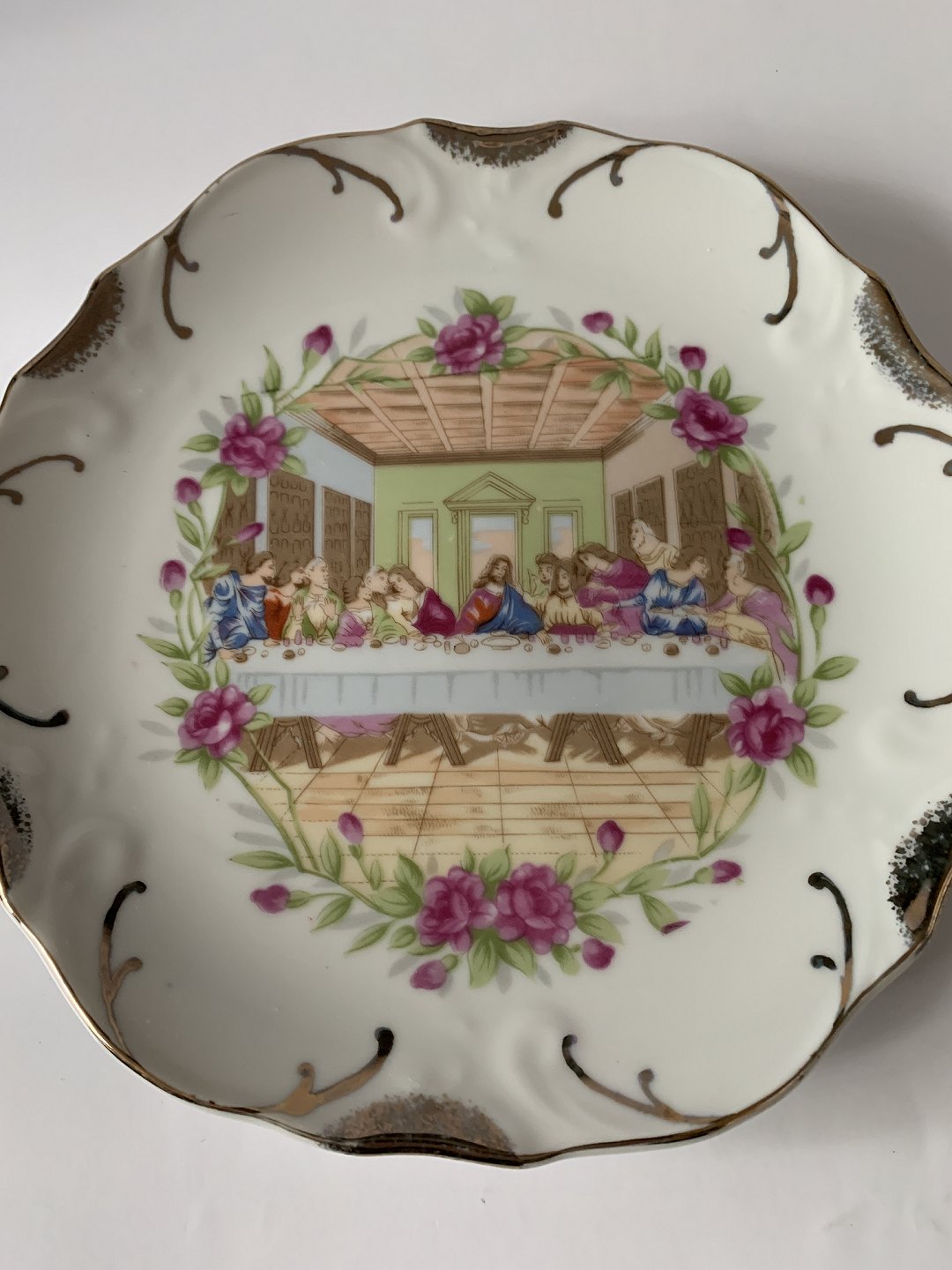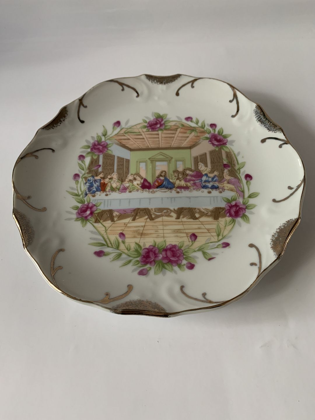 Dekorativ platte med religiøst motiv af den sidste Nadver, omkranset af blomstermotiv. Platten har 18 karat guldkant, hvilket gør den noget ganske specielt. Tegningerne er lavet med sans for detaljer, der giver platten sit smukke udtryk.