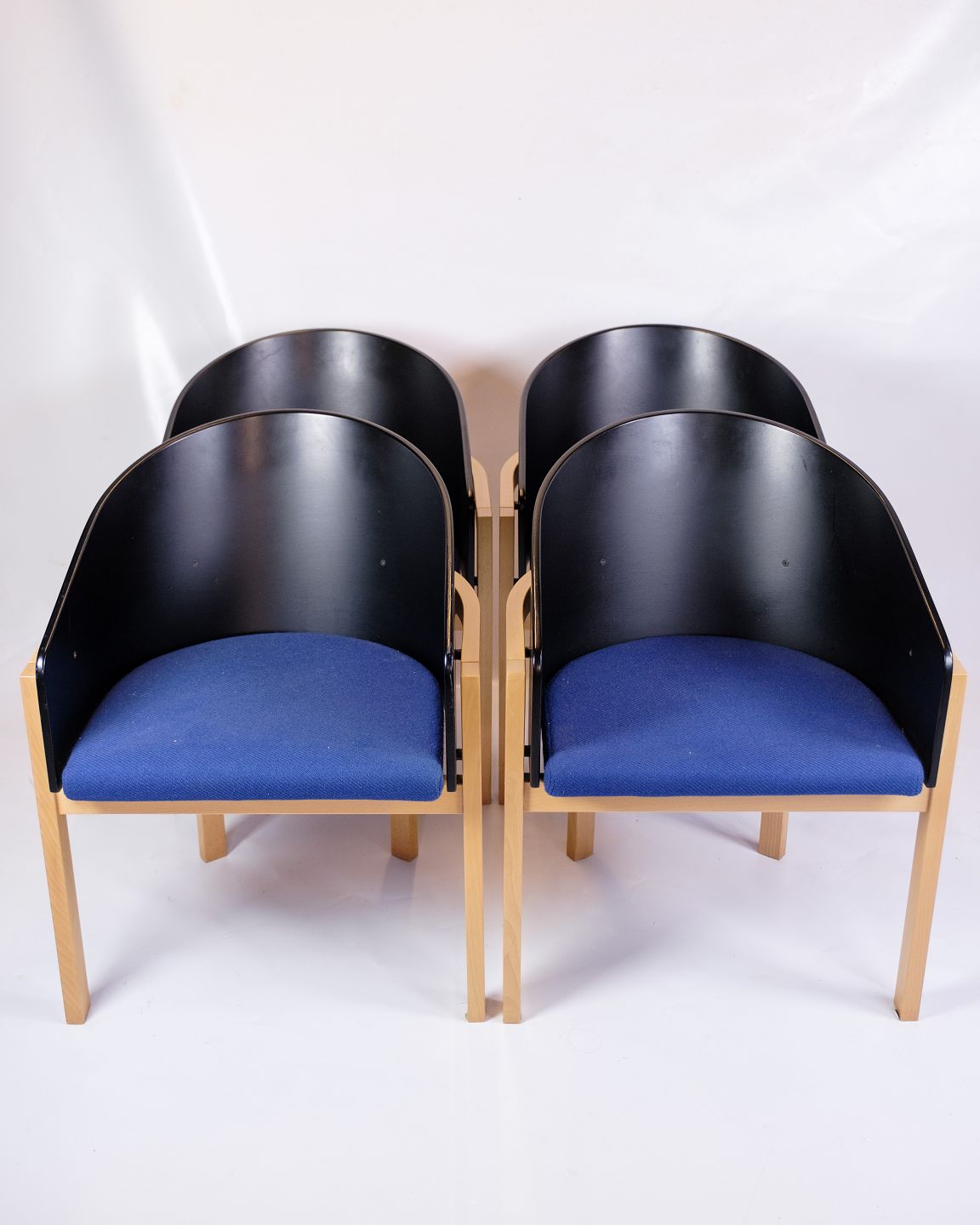 Dette sæt af fire spisestuestole fra 1960'erne, designet og fremstillet af Kvist Møbler, er et fremragende eksempel på dansk mid-century modern design. Stolene kombinerer stel af bøg med sorte skaller og sæder betrukket i blåt stof, hvilket skaber en elegant og tidløs æstetik.