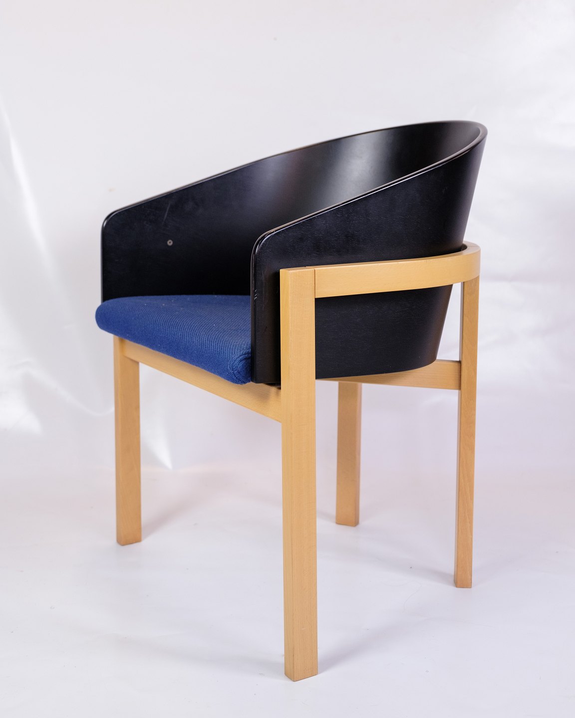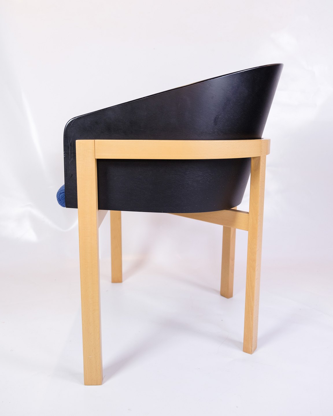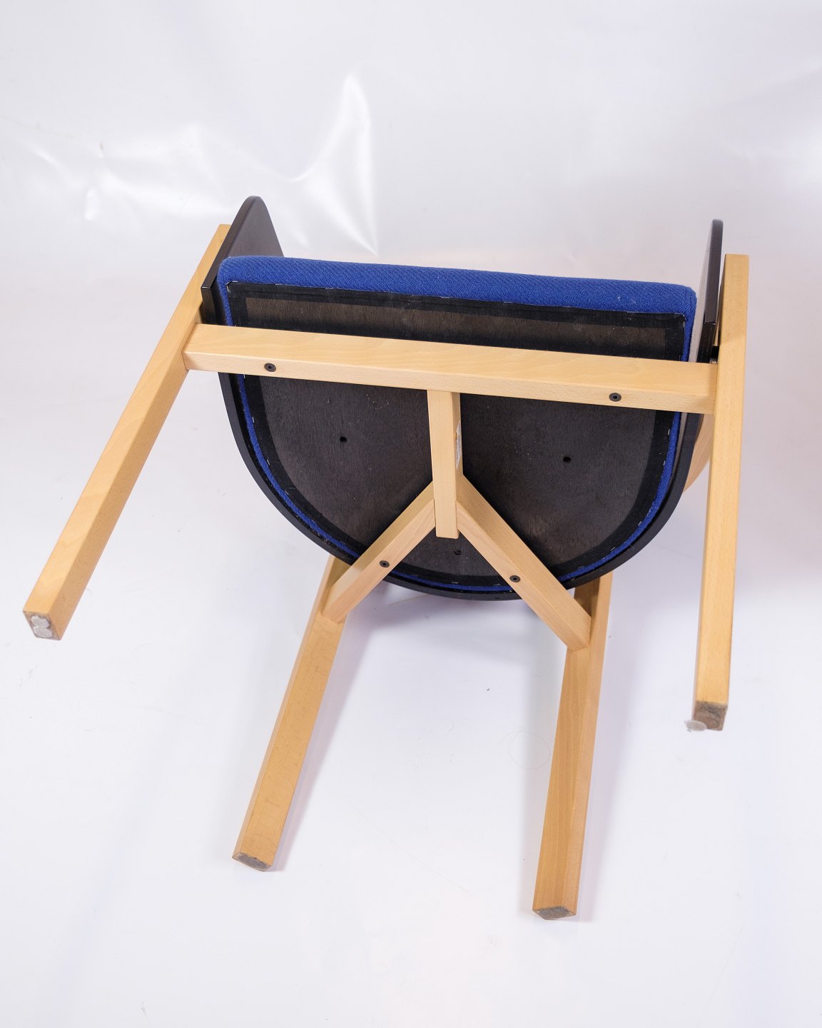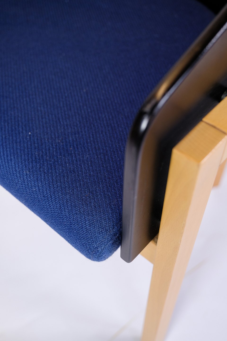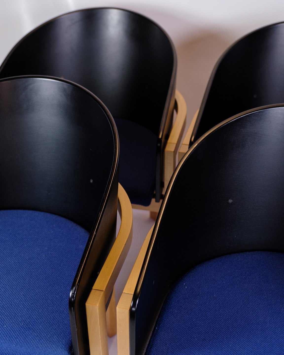 De sorte skaller på stoleryggene giver en flot kontrast til det lyse bøgetræ og tilføjer en moderne og stilfuld dimension til designet. Den sorte farve skaber en elegant ramme om sæderne, der er betrukket med blåt stof. Det blå stof giver en frisk farveaccent og er samtidig komfortabelt og slidstærkt, hvilket sikrer, at stolene forbliver behagelige og attraktive over tid.