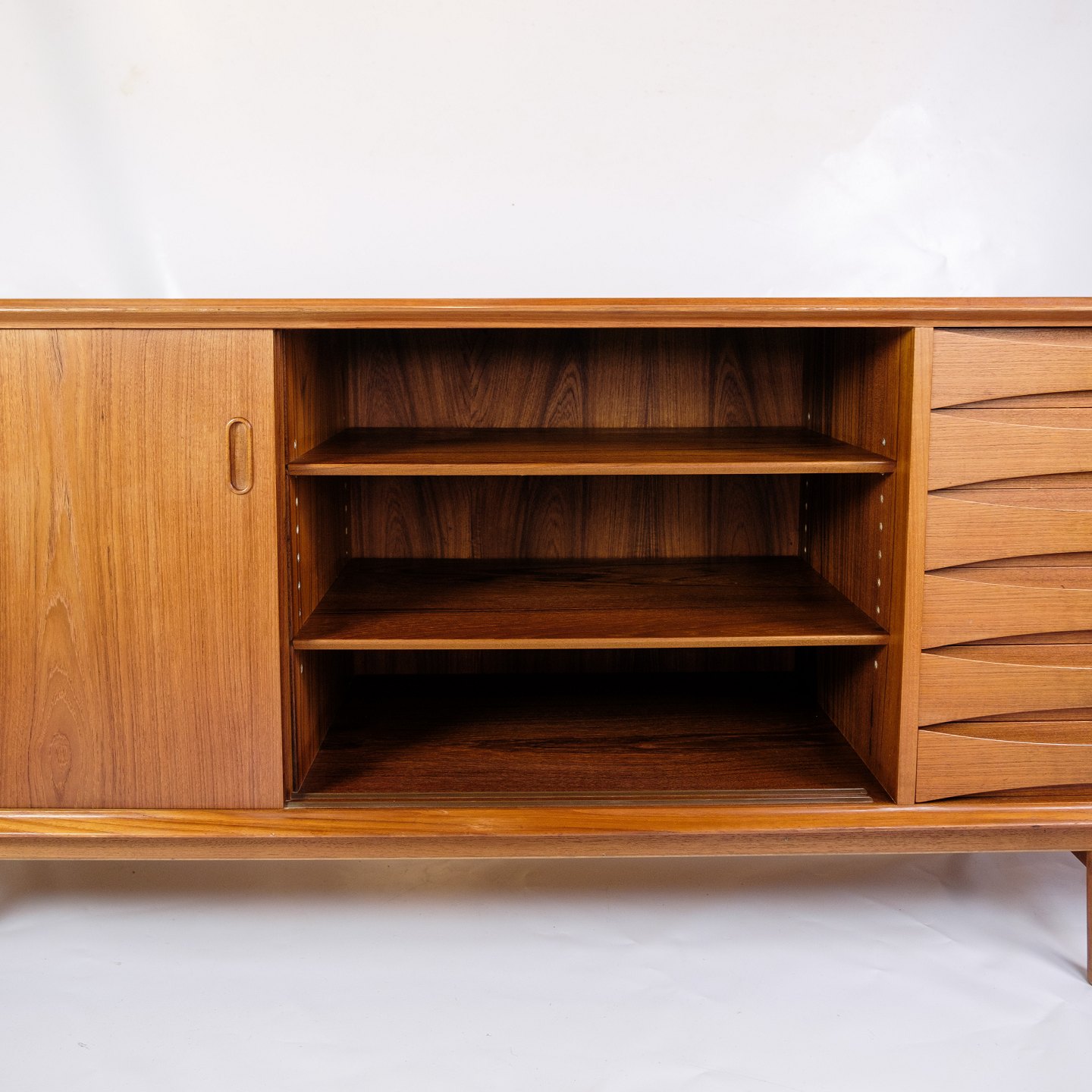 The sideboard's main material is teak, known for its durability and rich, warm tone. The teak's natural grain patterns and colors are highlighted by a smooth finish that both protects the wood and highlights its aesthetic qualities. Teak was a popular material in mid-century design due to its strength and beauty, ensuring that the furniture can withstand daily use while maintaining its elegance.