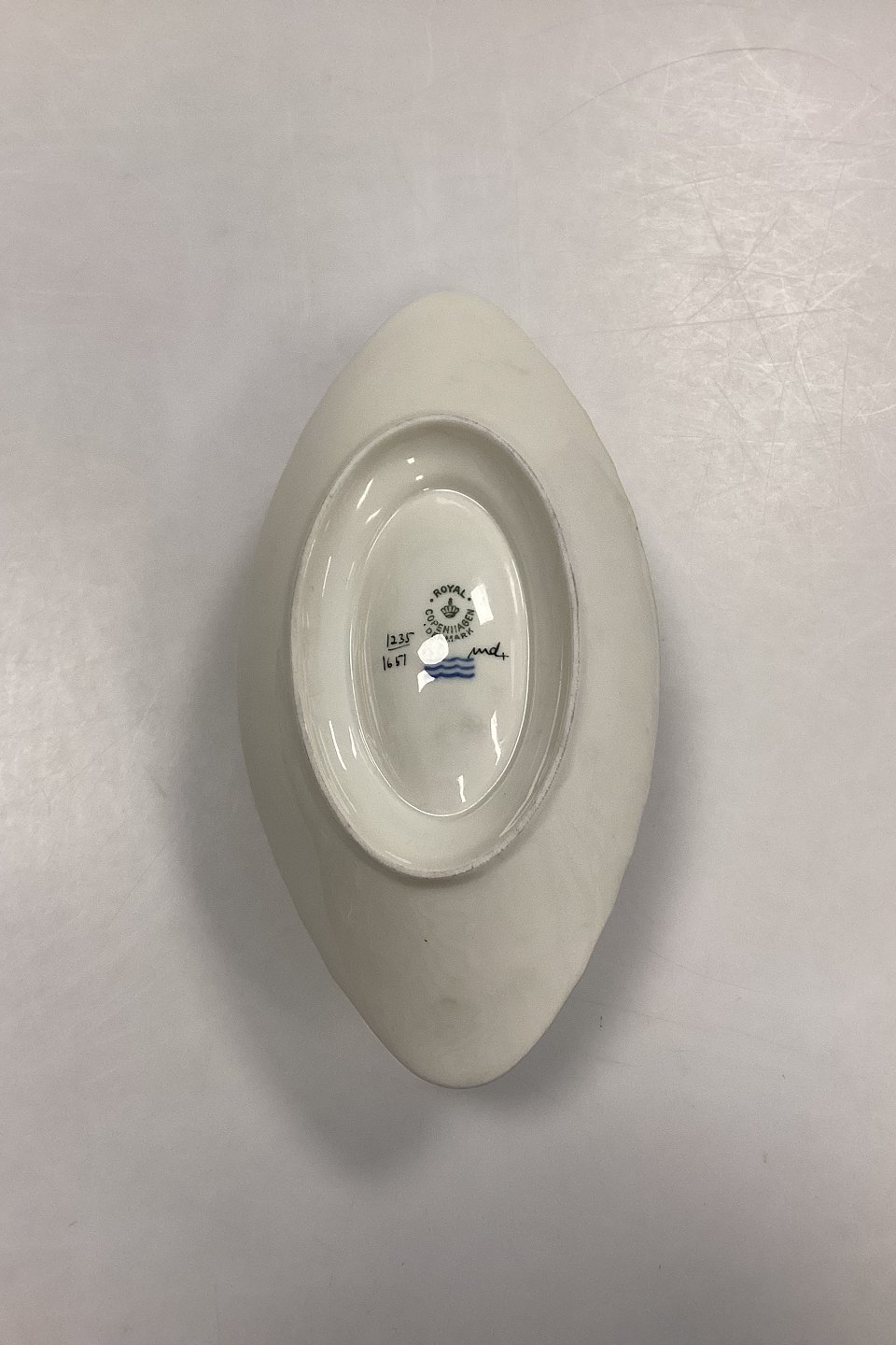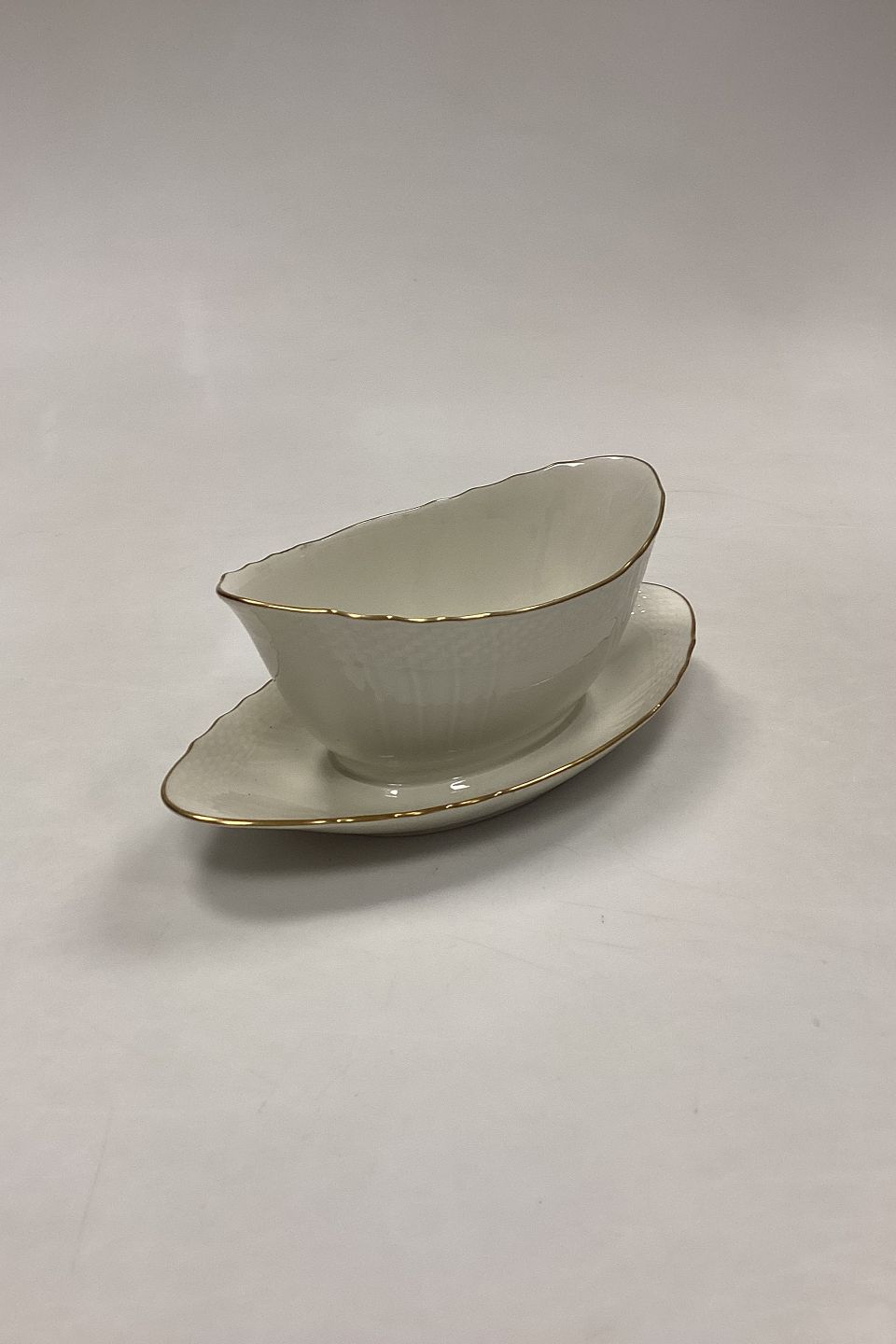 Royal Copenhagen Creme Svejfet med Guld (Stel 1235) Sovseskål No. 1651. Måler 17,5 cm x 9,3 cm / 6,88 in. x 3,66 in. Fast underskål måler 22 cm / 8,66 in.