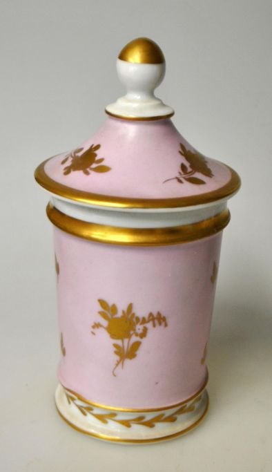German hand-painted porcelain lidded jar, 19th century. White porcelain with pink overpaint. Midterfeldt decorated with flower bouquet. Additional gilt strewn flowers and tendrils on corpus. Lid decorated with lid knob and gilded flowers. Unsigned. H.: 15 cm.