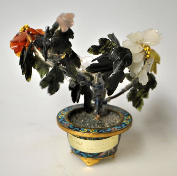Kinesisk jade busk i cloissonne kumme, 20. årh. Udformet som busk med forskellig farvede jader i kumme af cloissonne. Højde.: 13,5 cm.