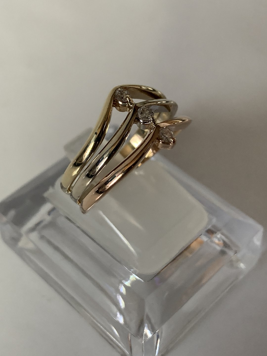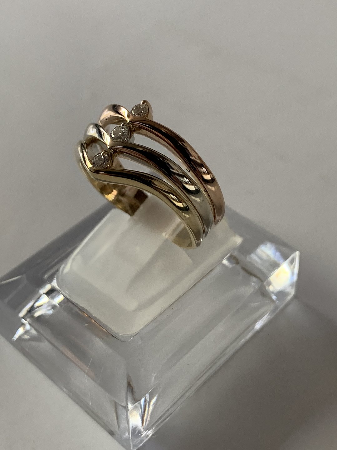 Damering i 14 karat, 3-farvet hvid- og rødguld med brillanter. Stemplet 585. Str. 58
