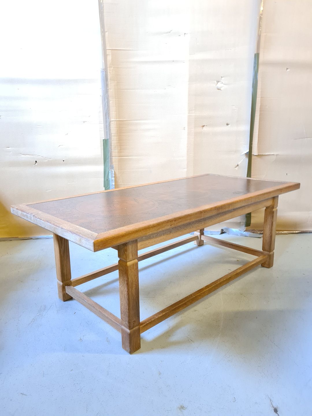 Sofabord i massivt egetræ med metal plade, fra 1980erne.