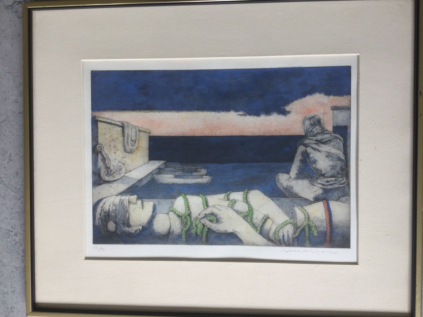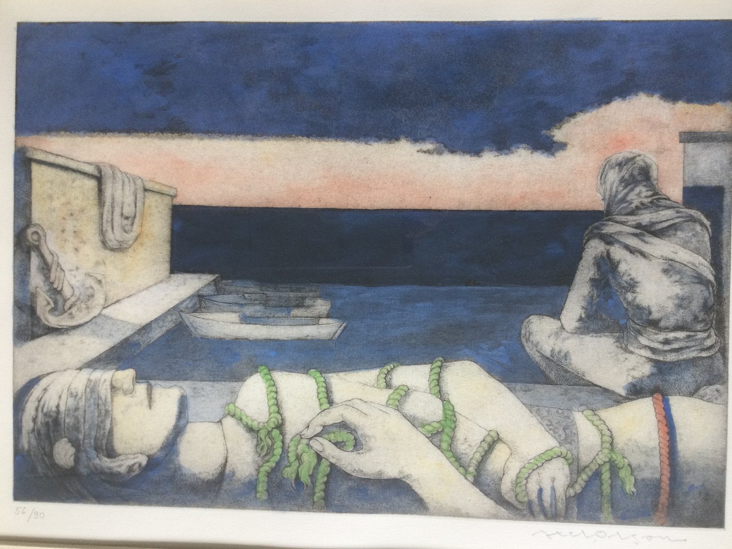Farvelitografi af Axel Olson - Komposition - Aften ved havet.