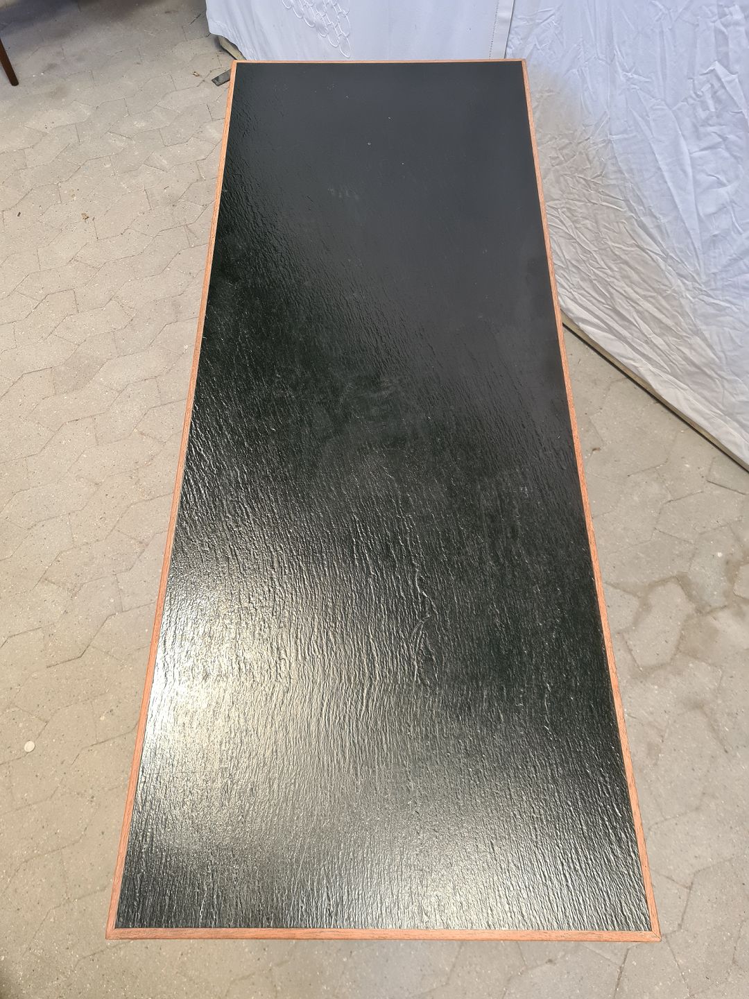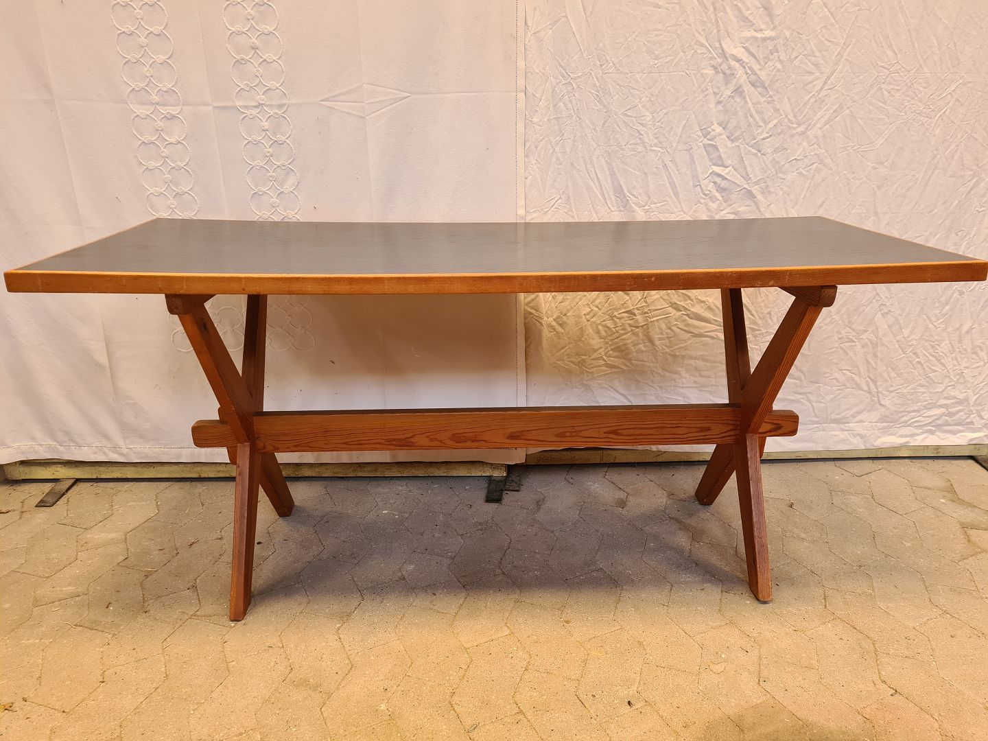 Bord med understel i massivt fyrretræ, plade med lister af egetræ og linoleum.