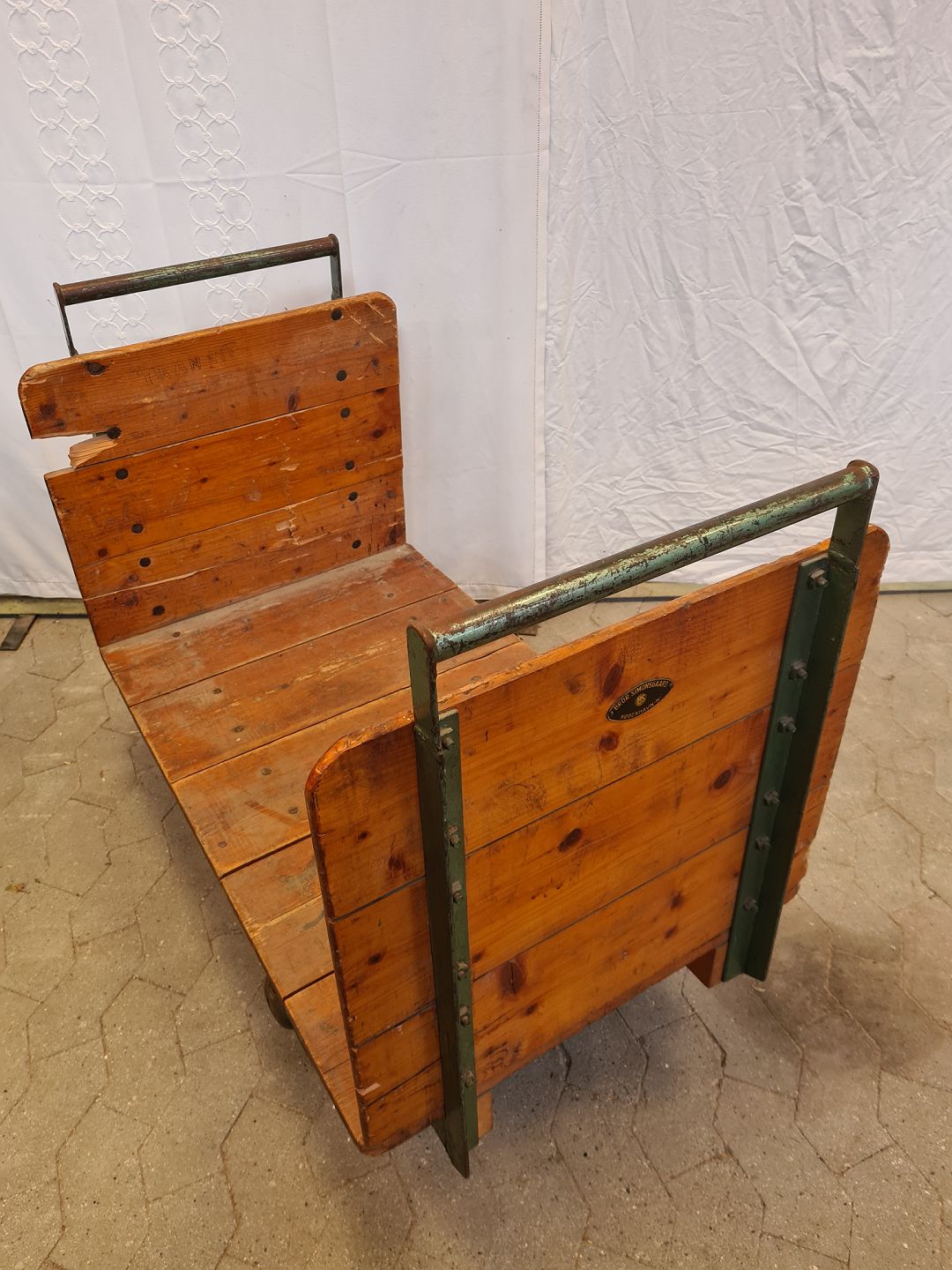 Gammel jernbanevogn i metal og fyrretræ, fra 1930erne.