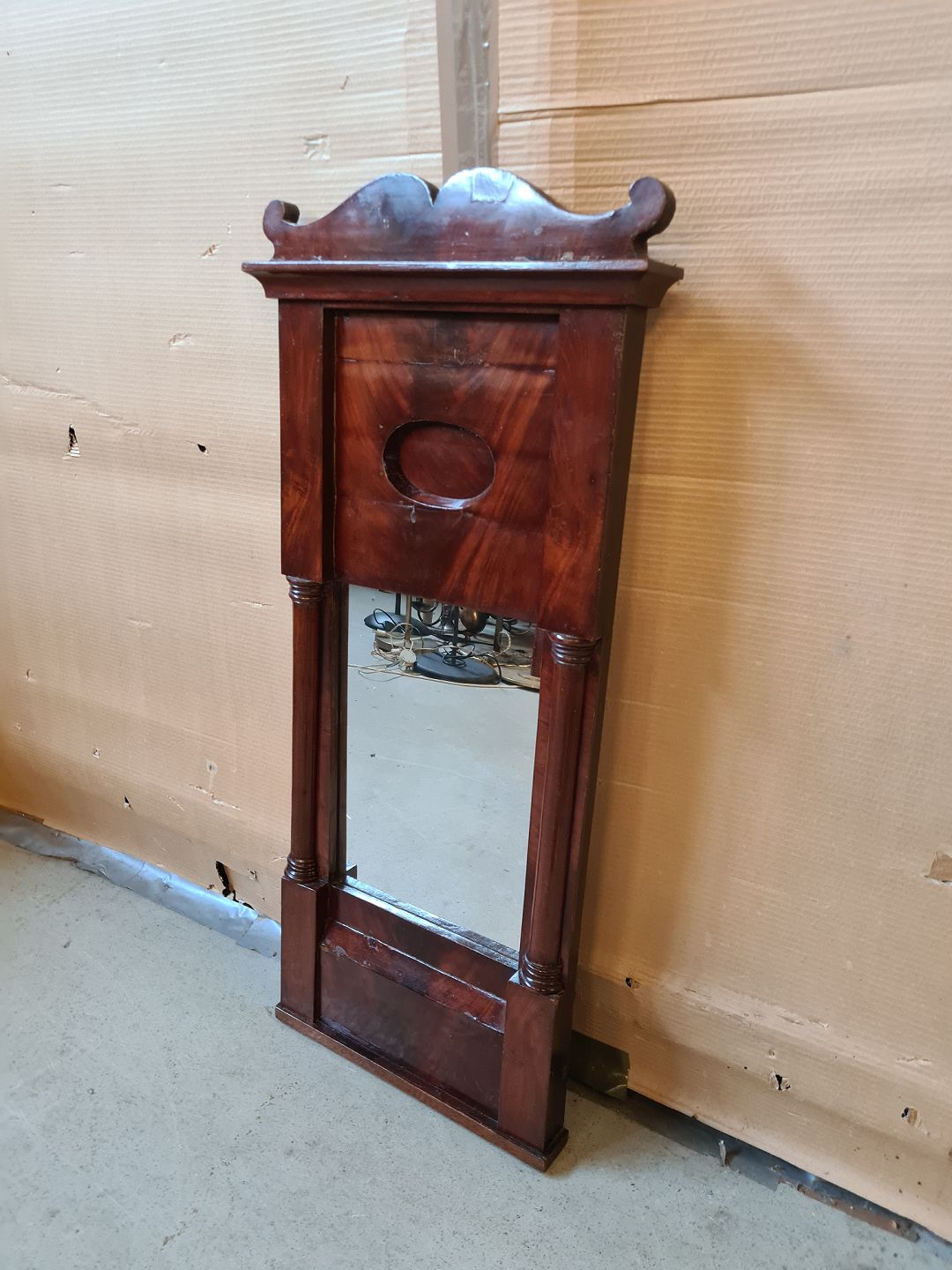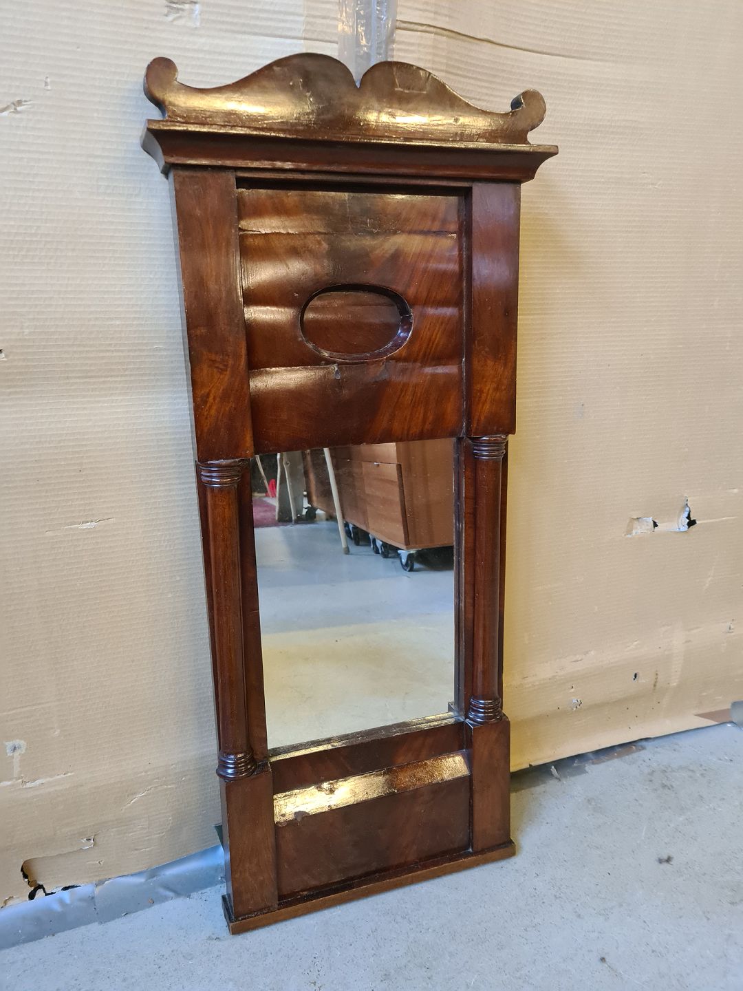 Spejl i fineret mahogni, fra 1900erne.