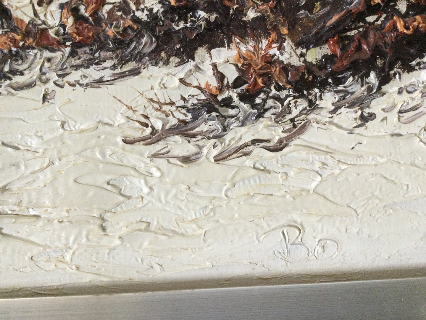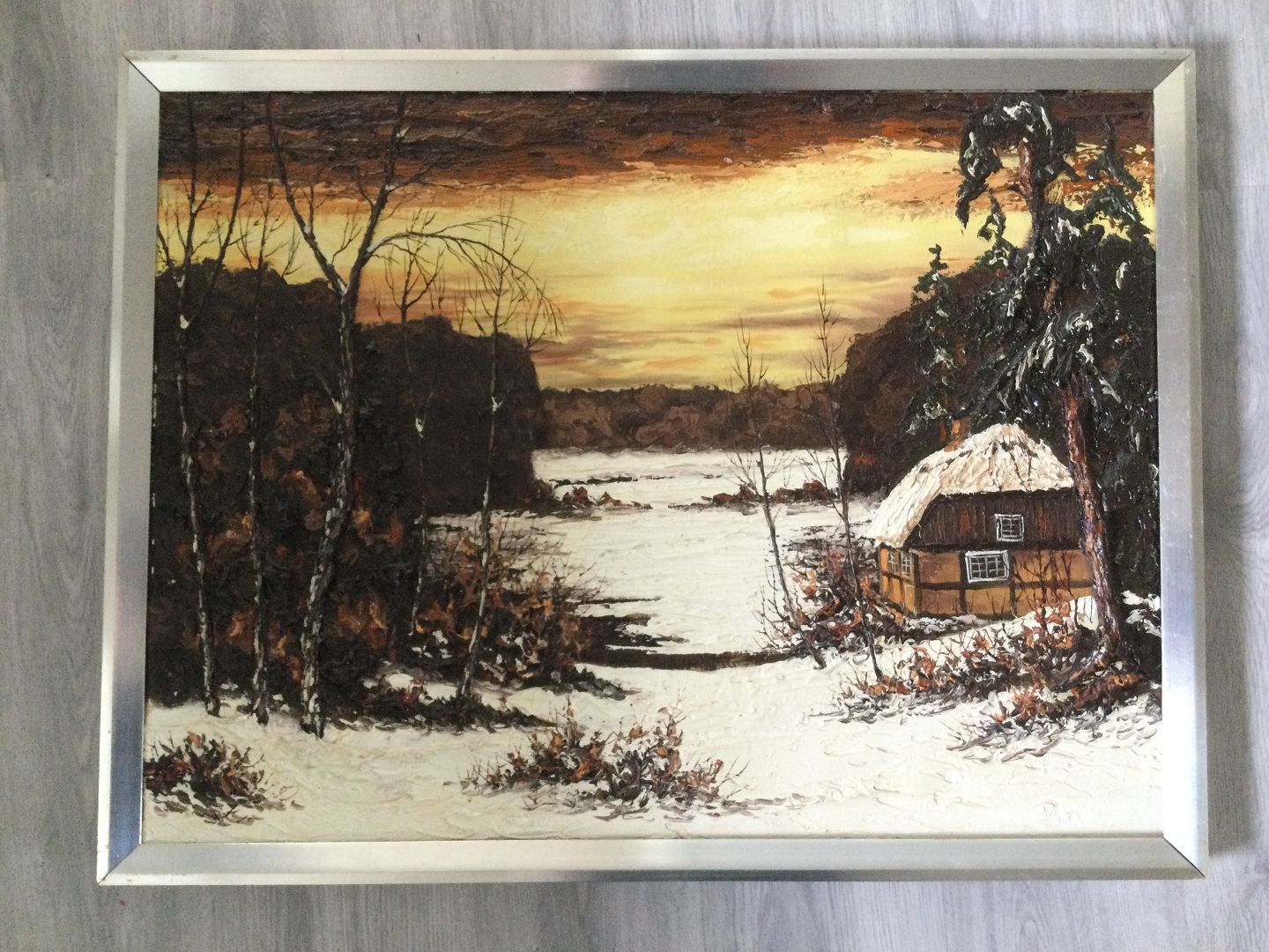 Text available in Danish: Maleri af Bo Hansen 1972 - Vinterparti fra Frijsenborg Skov.