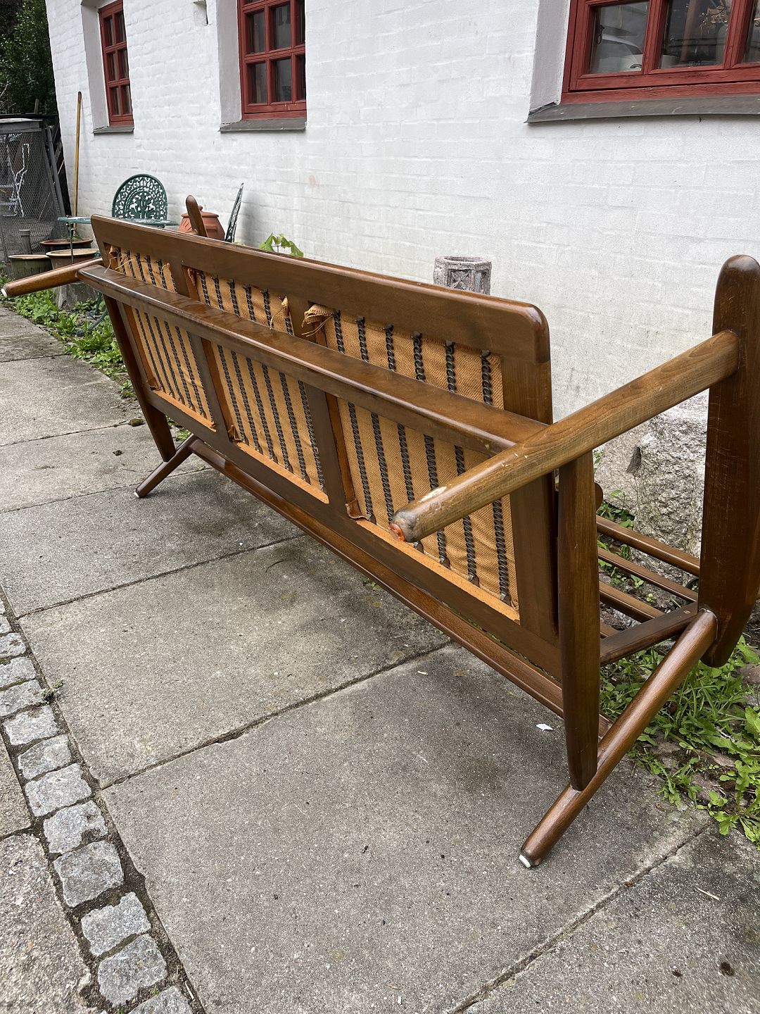 Hans J. Wegner 3. Personers sofa i bejset bøgetræ og fjedrehynder betrukket med Uldstof produceret af Getama i 1950’erne.