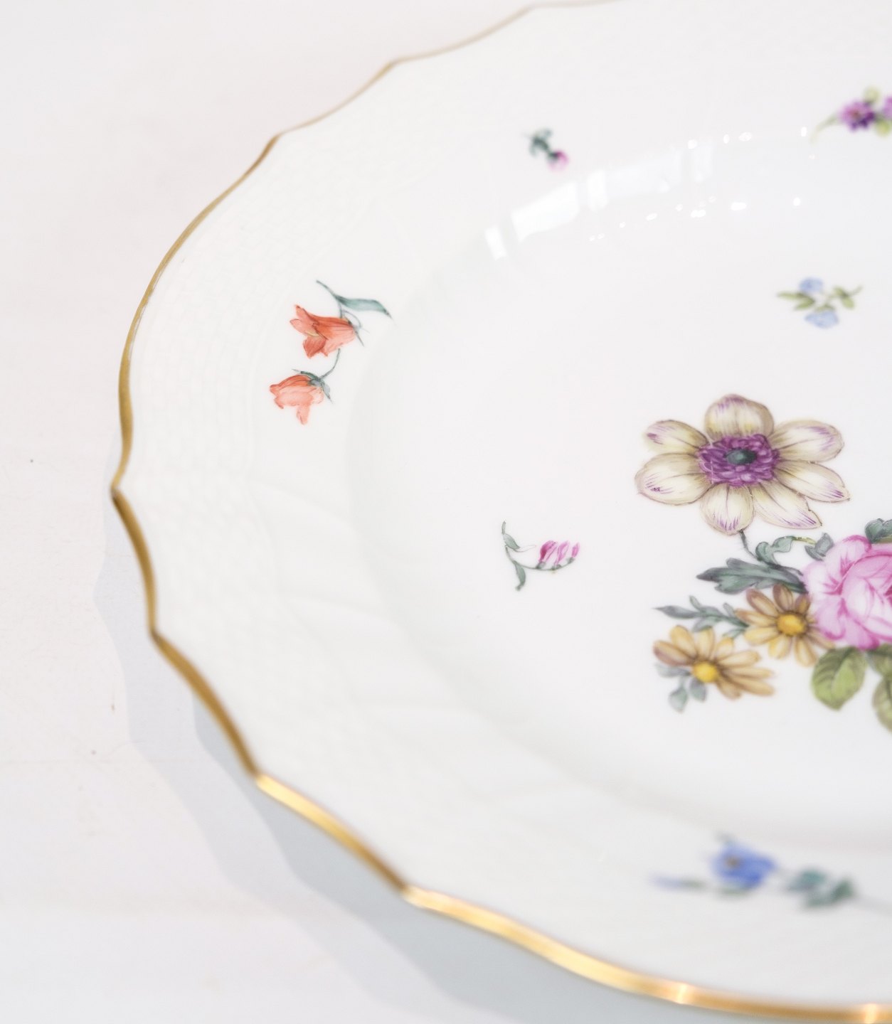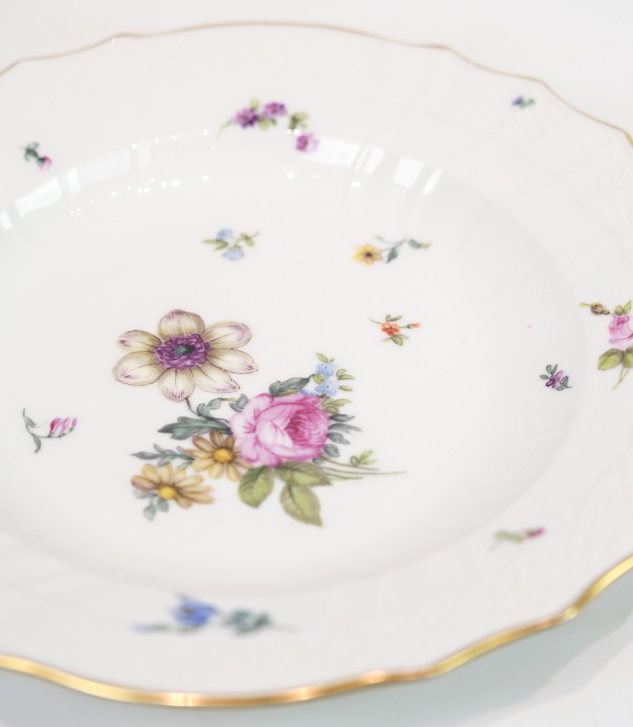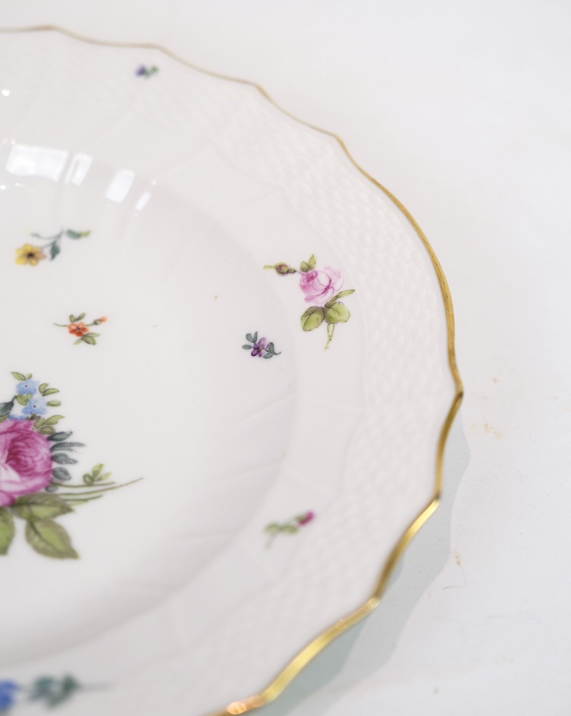Middagstallerkener af Kongelig porcelæn med mønstret Saksisk blomst dekoreret i kanten med guld. Fremstillet af Royal Copenhagen i ca. 1923, hvor alle deres varer er blevet håndmalet og efterfølgende blevet meget sjældne. Tallerkenerne står uden mangler eller defekter.