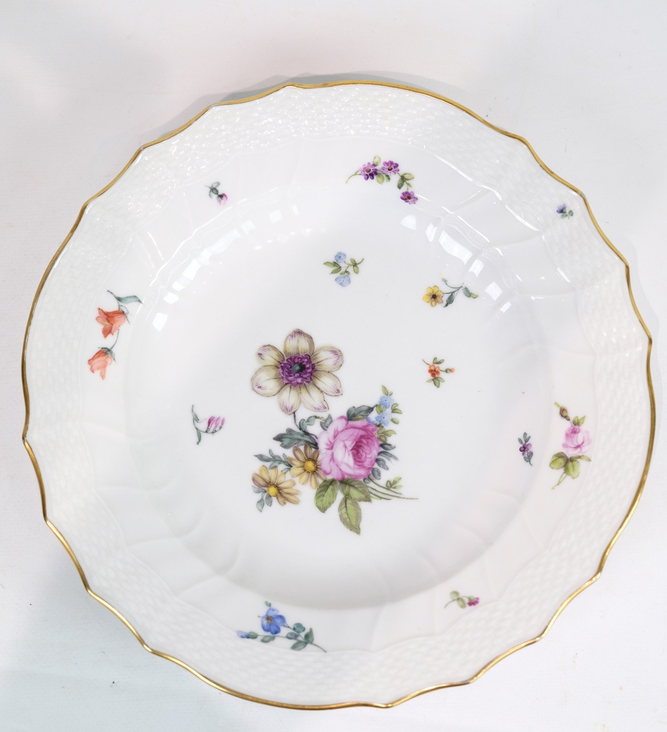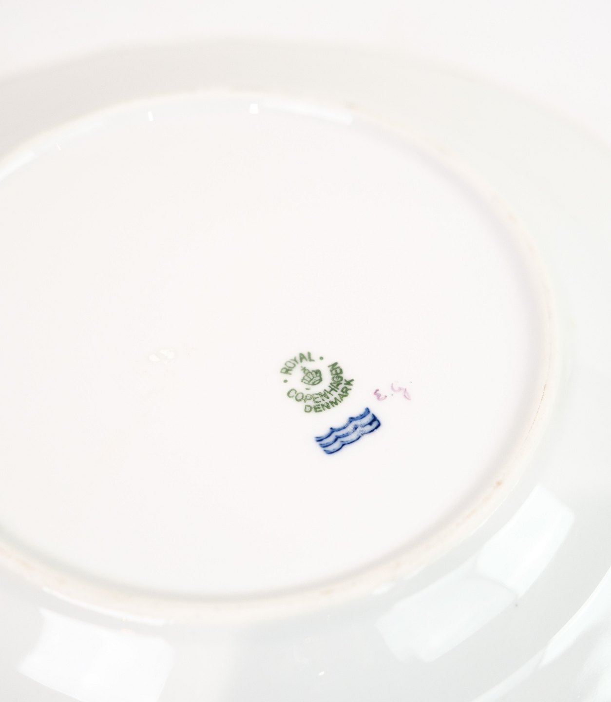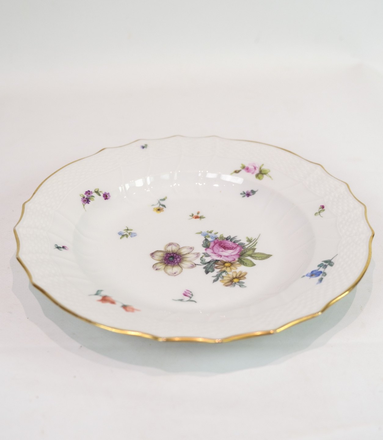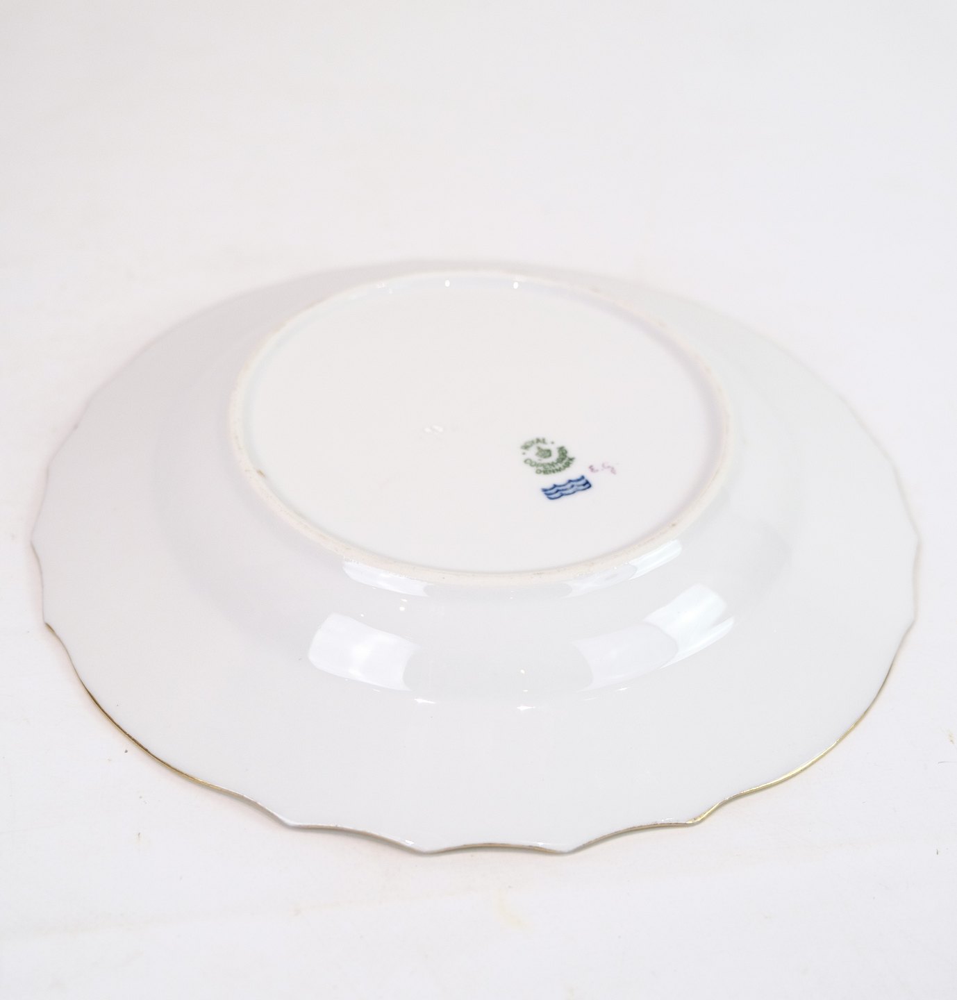 Middagstallerkener af Kongelig porcelæn med mønstret Saksisk blomst dekoreret i kanten med guld. Fremstillet af Royal Copenhagen i ca. 1923, hvor alle deres varer er blevet håndmalet og efterfølgende blevet meget sjældne. Tallerkenerne står uden mangler eller defekter.