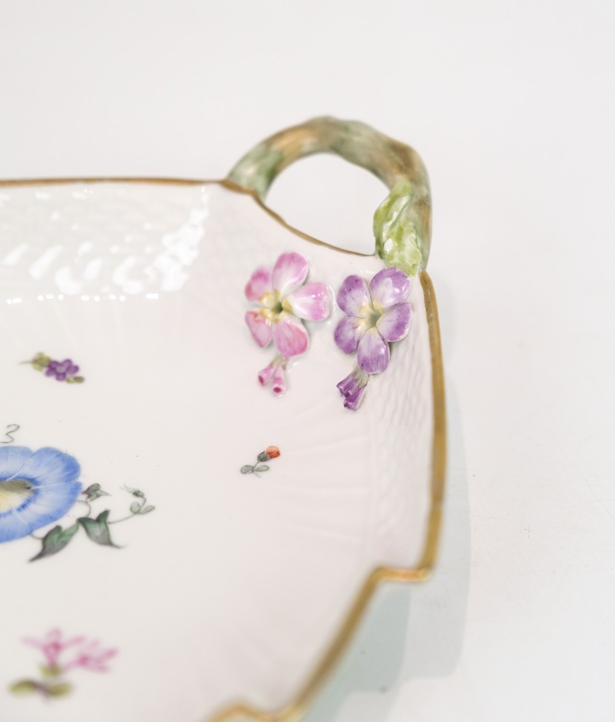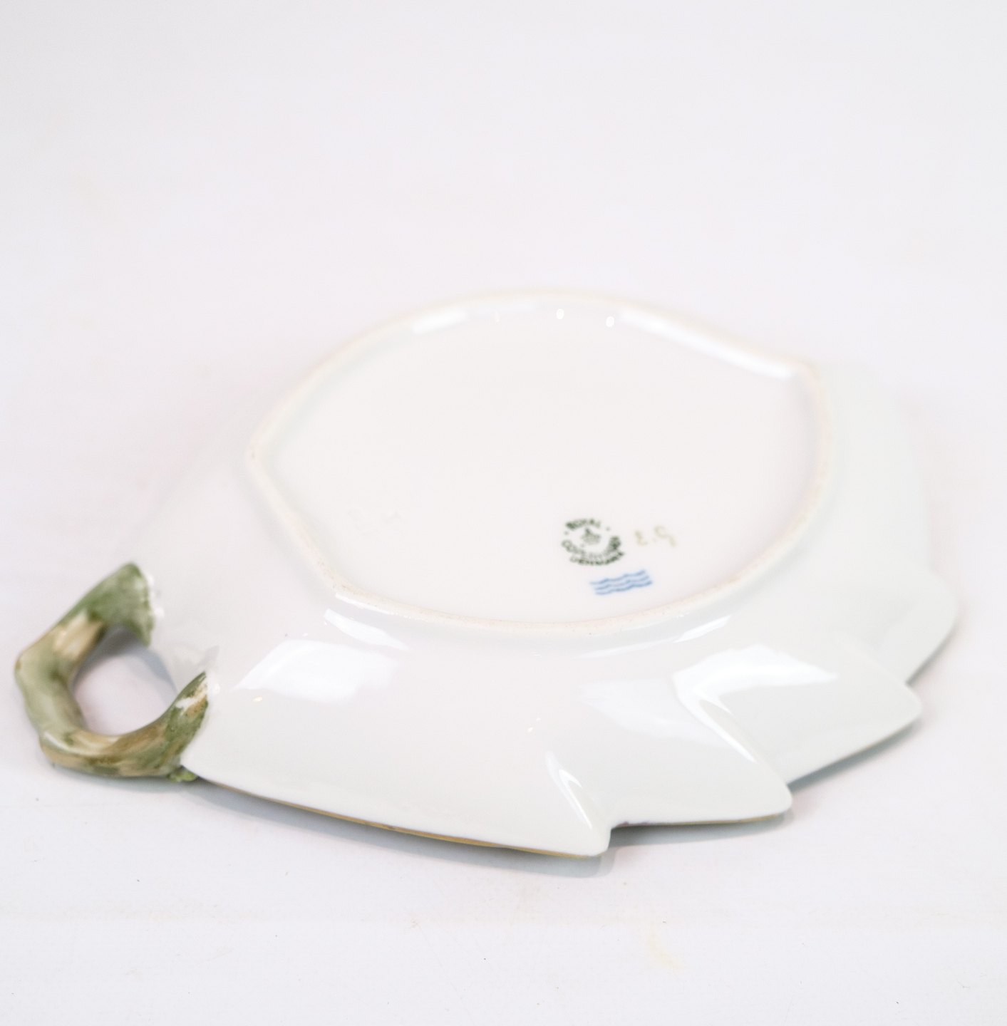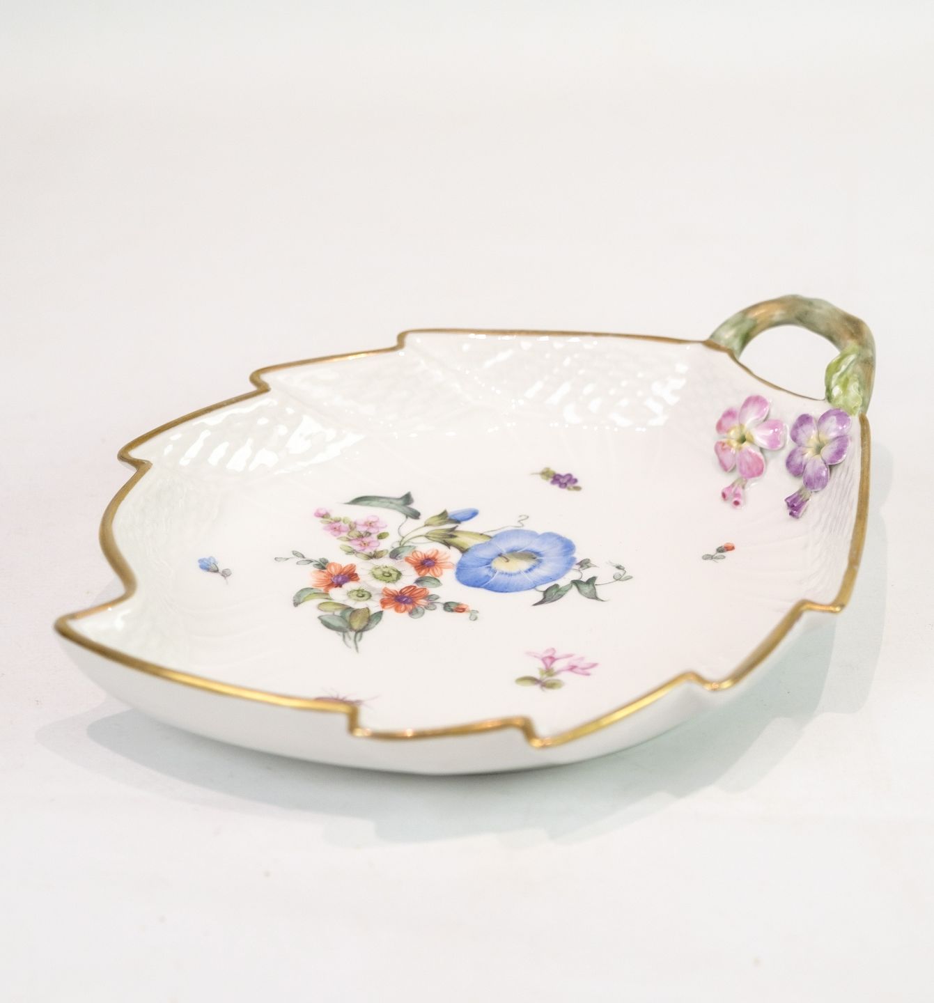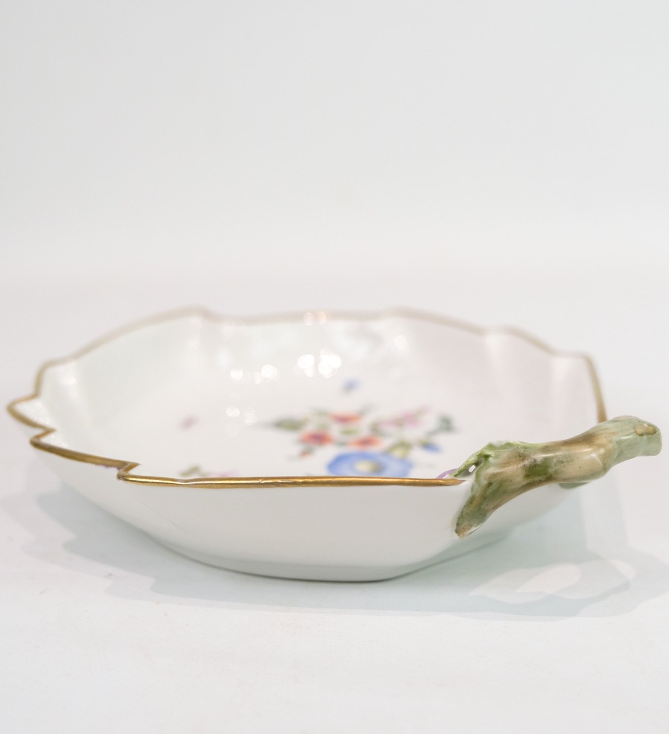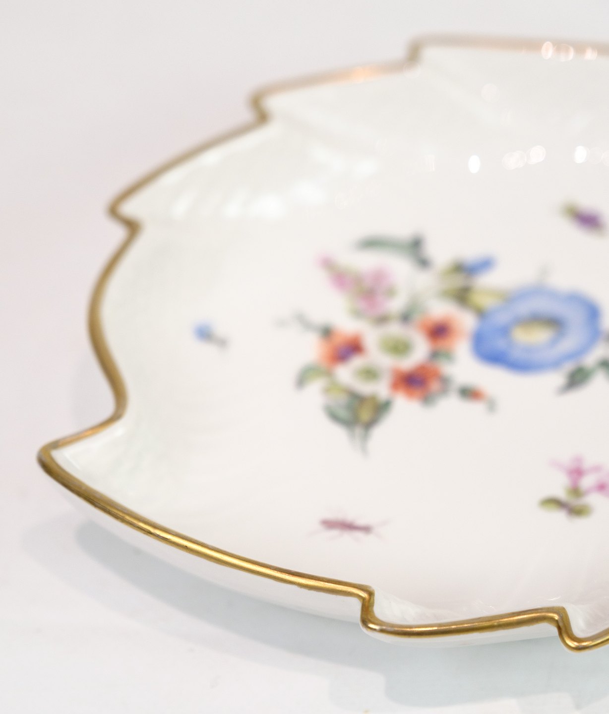 Bladformet Fad af Kongelig porcelæn med mønstret Saksisk blomst dekoreret i kanten med guld. Fremstillet af Royal Copenhagen i ca. 1923, hvor alle deres varer er blevet håndmalet og efterfølgende blevet meget sjældne. Det bladformet Fad står uden mangler eller defekter.