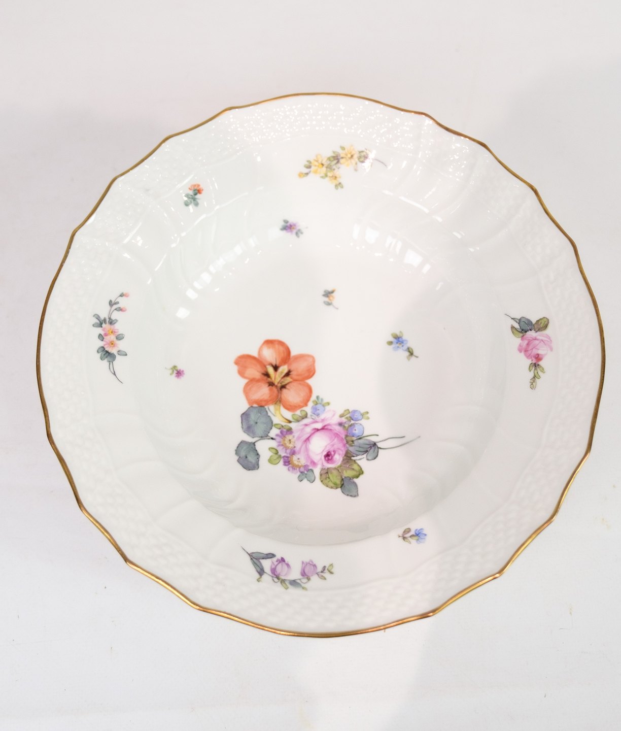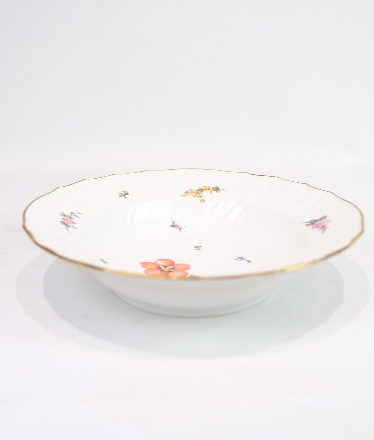 Dybe/Pasta Tallerkener af Kongelig porcelæn med mønstret Saksisk blomst dekoreret i kanten med guld. Fremstillet af Royal Copenhagen i ca. 1923, hvor alle deres varer er blevet håndmalet og efterfølgende blevet meget sjældne. Tallerkenerne står uden mangler eller defekter.