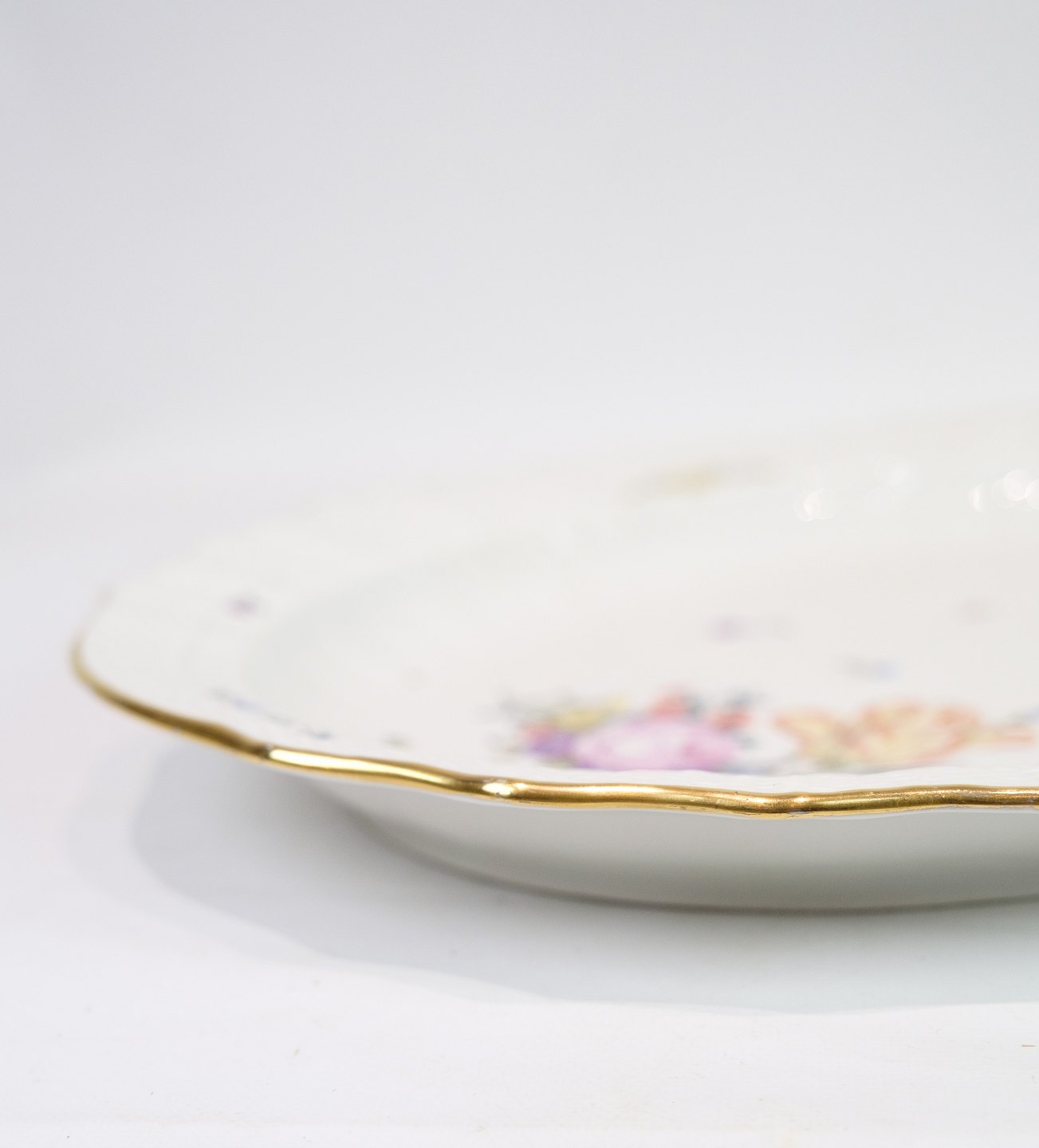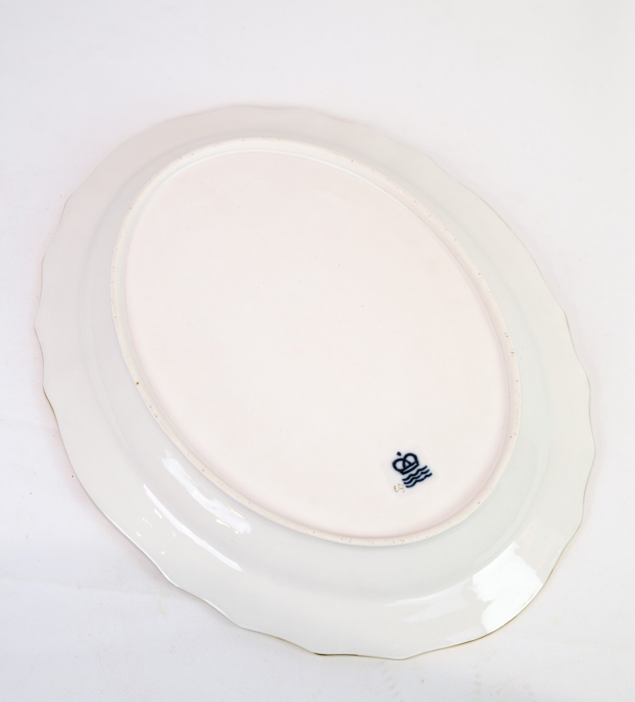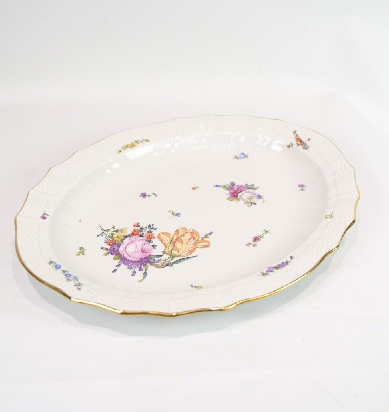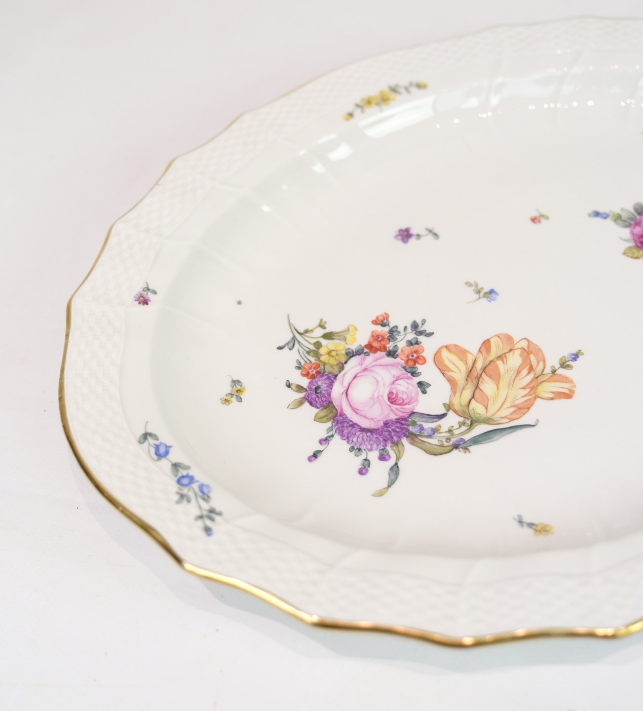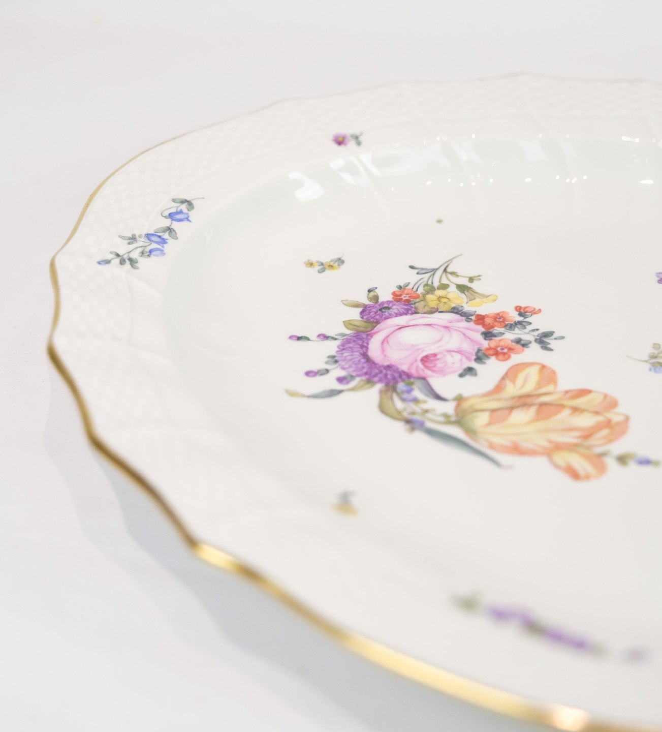 Fad af Kongelig porcelæn med mønstret Saksisk blomst dekoreret i kanten med guld. Fremstillet af Royal Copenhagen i ca. 1923, hvor alle deres varer er blevet håndmalet og efterfølgende blevet meget sjældne. Fadet står uden mangler eller defekter.