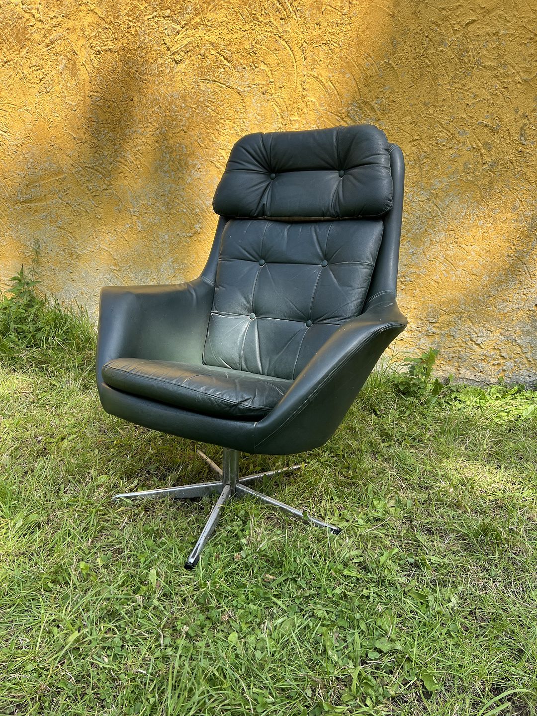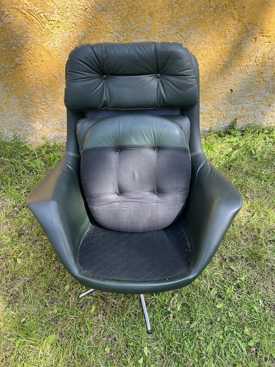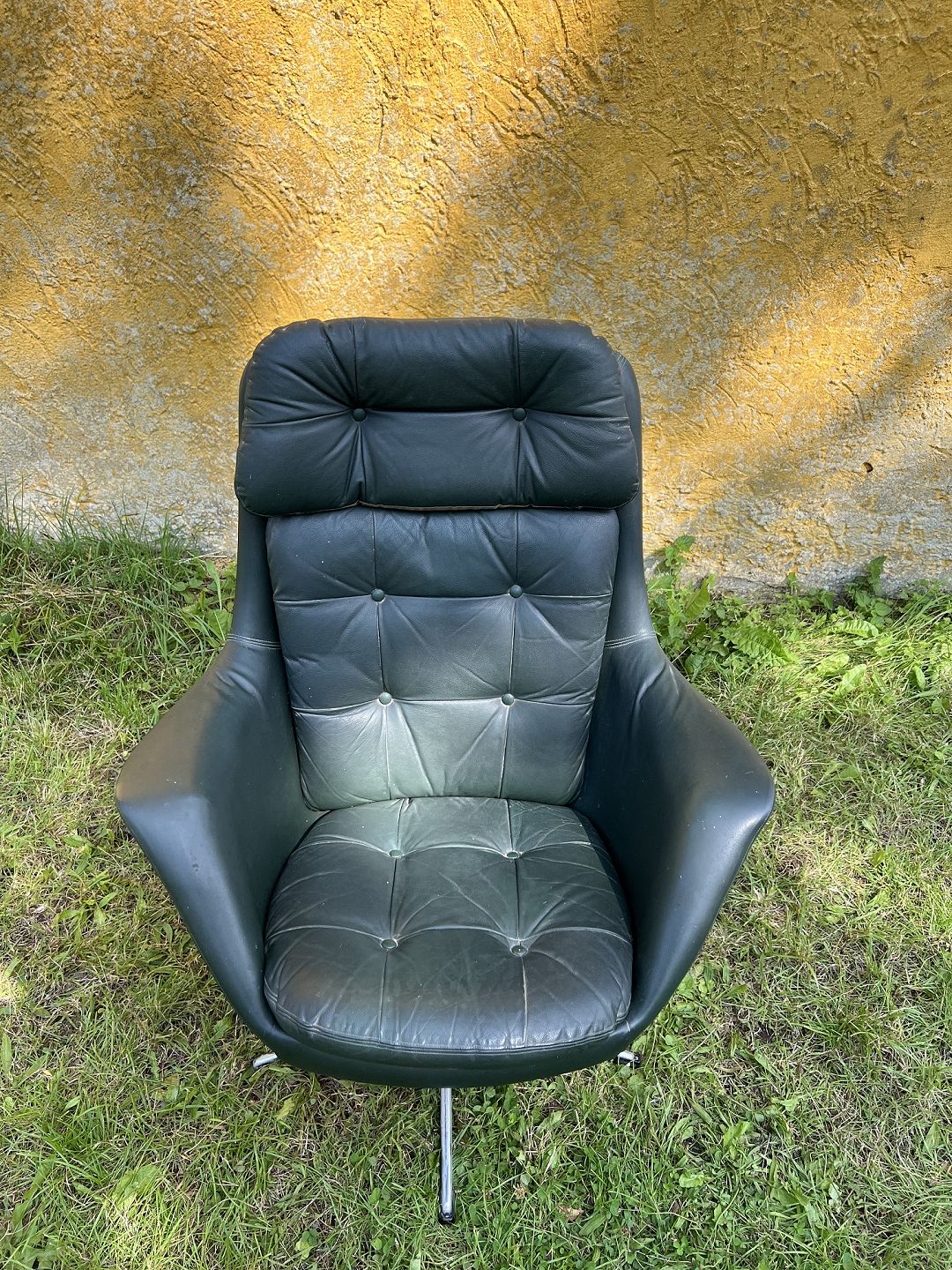 Højrykket lænestol polstret i grøn læder med drejefod af metal.