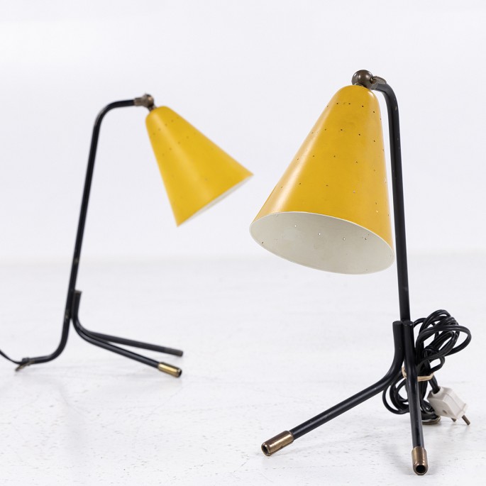 Pair of tablelamps in black- and yellow lacquered metal with shoes in brass. 1950's.