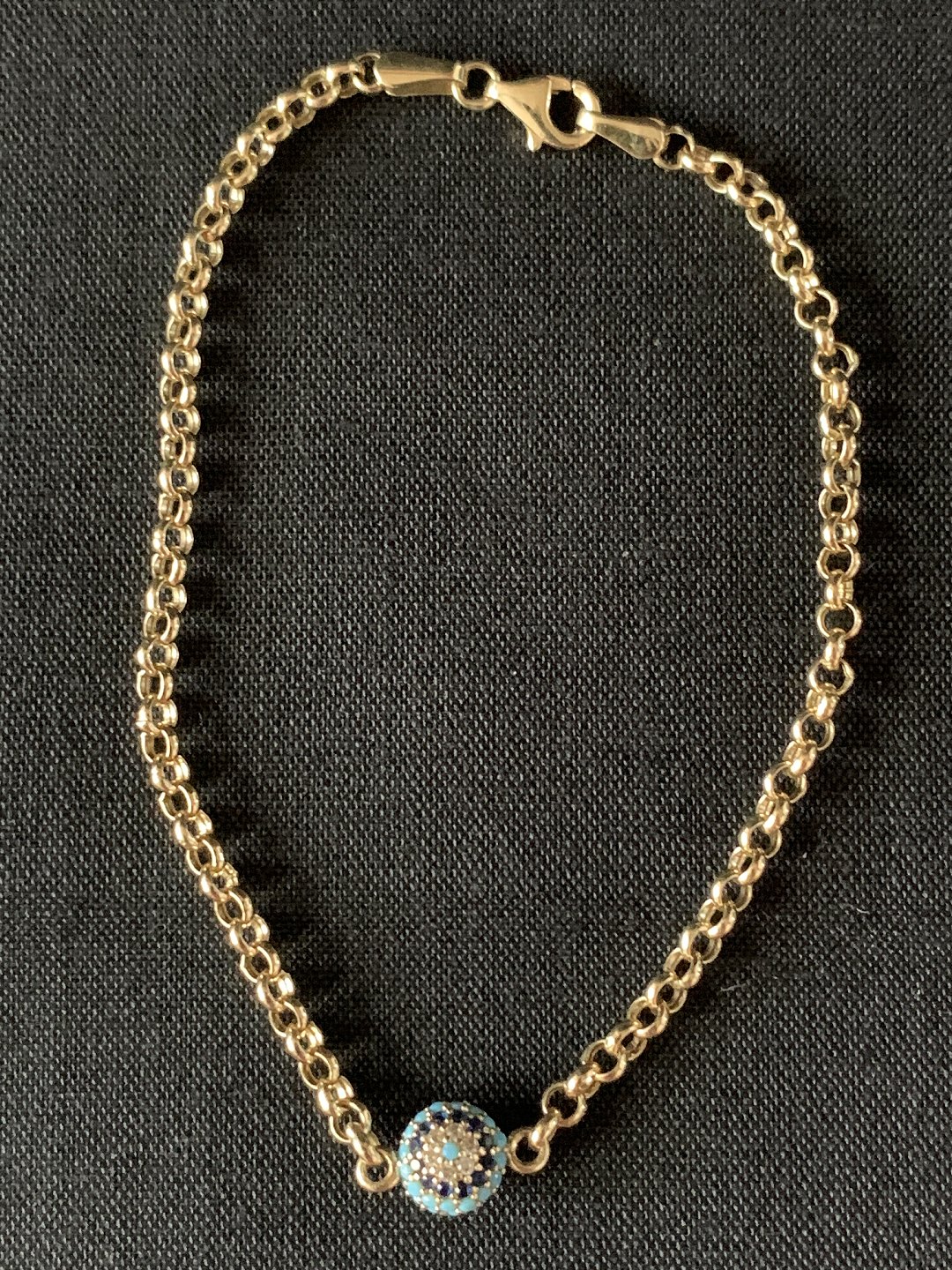 Guldkæde i 14 karat guld, med turkis og blå safirer og indlagte brillanter. Stemplet 585.