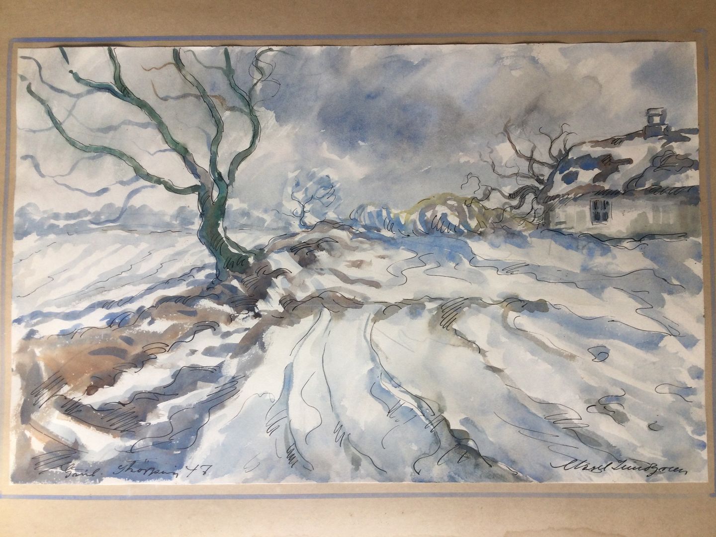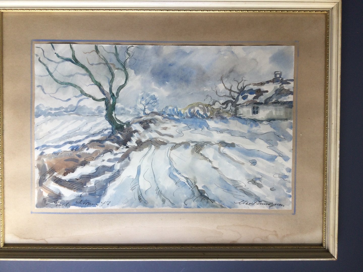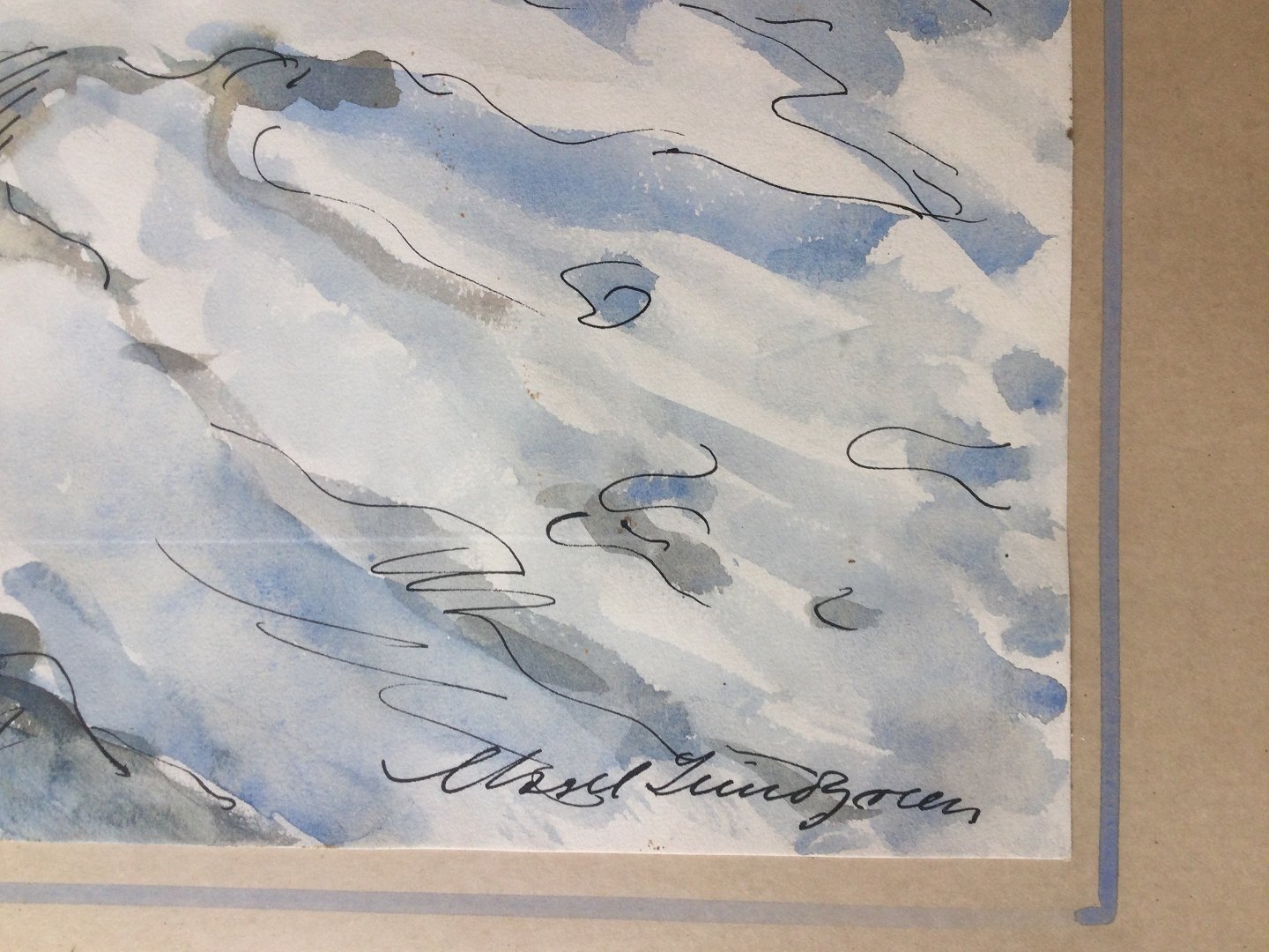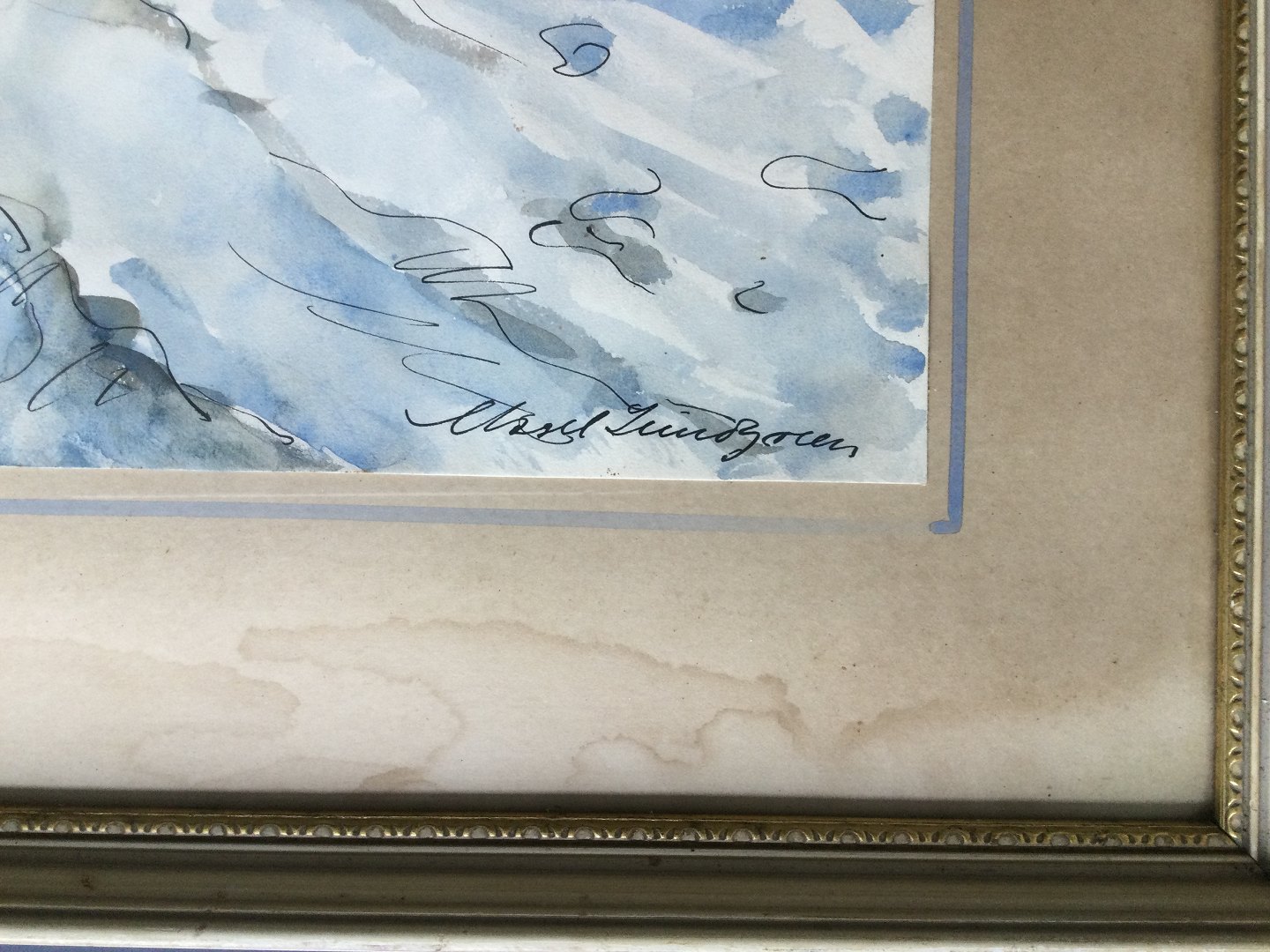 Indrammet med passepartout med blå akvarelstrib - typisk for Lundgreen - med fugtskade i bunden af passepartout.