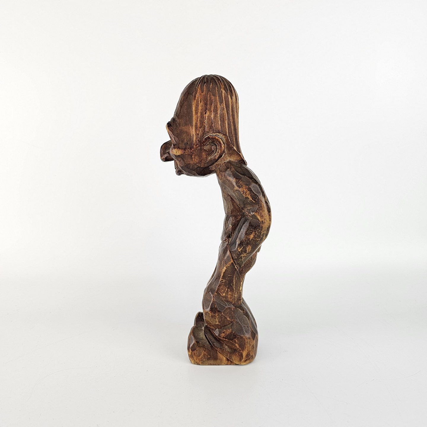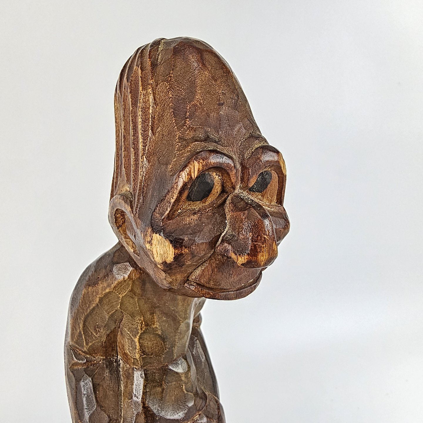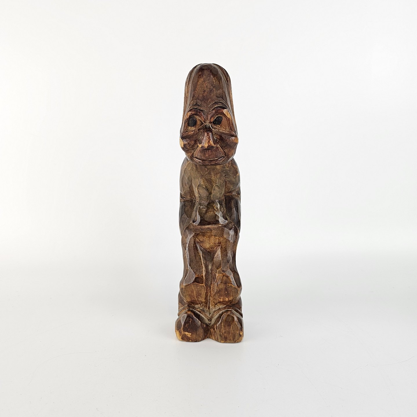 Håndsnittet træfigur udformet som en mand med krum ryg og hænderne i lommerne