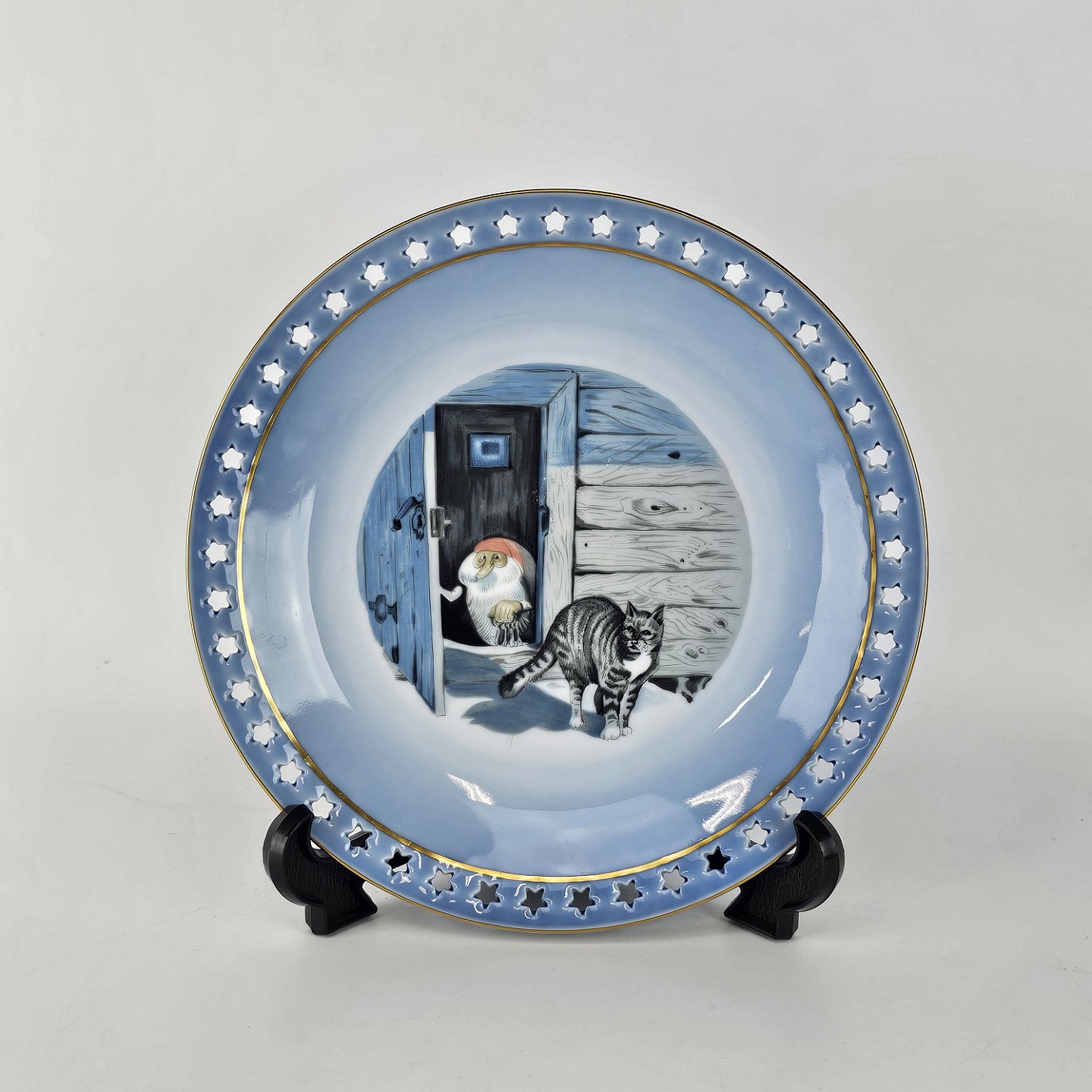 Julestellet er af hvidt porcelæn malet med blålige farver og dekoreret med en nisse og en kat. Tallerkenerne er derudover lavet med stjerneformet huller i kanten. Brugsspor kan forekomme