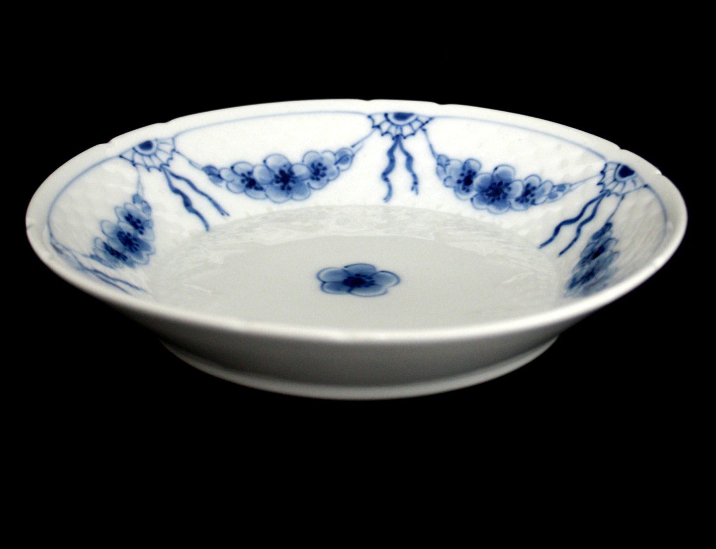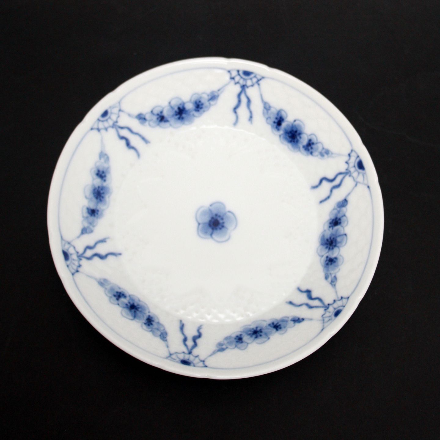 Text available in Danish: Bing & Grøndahl, Empire, hvidt porcelæn med blå ranker.