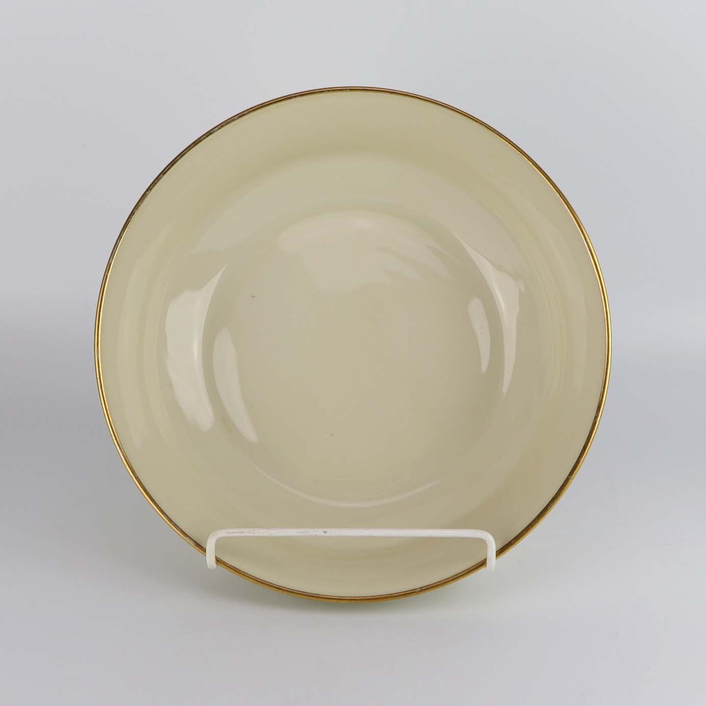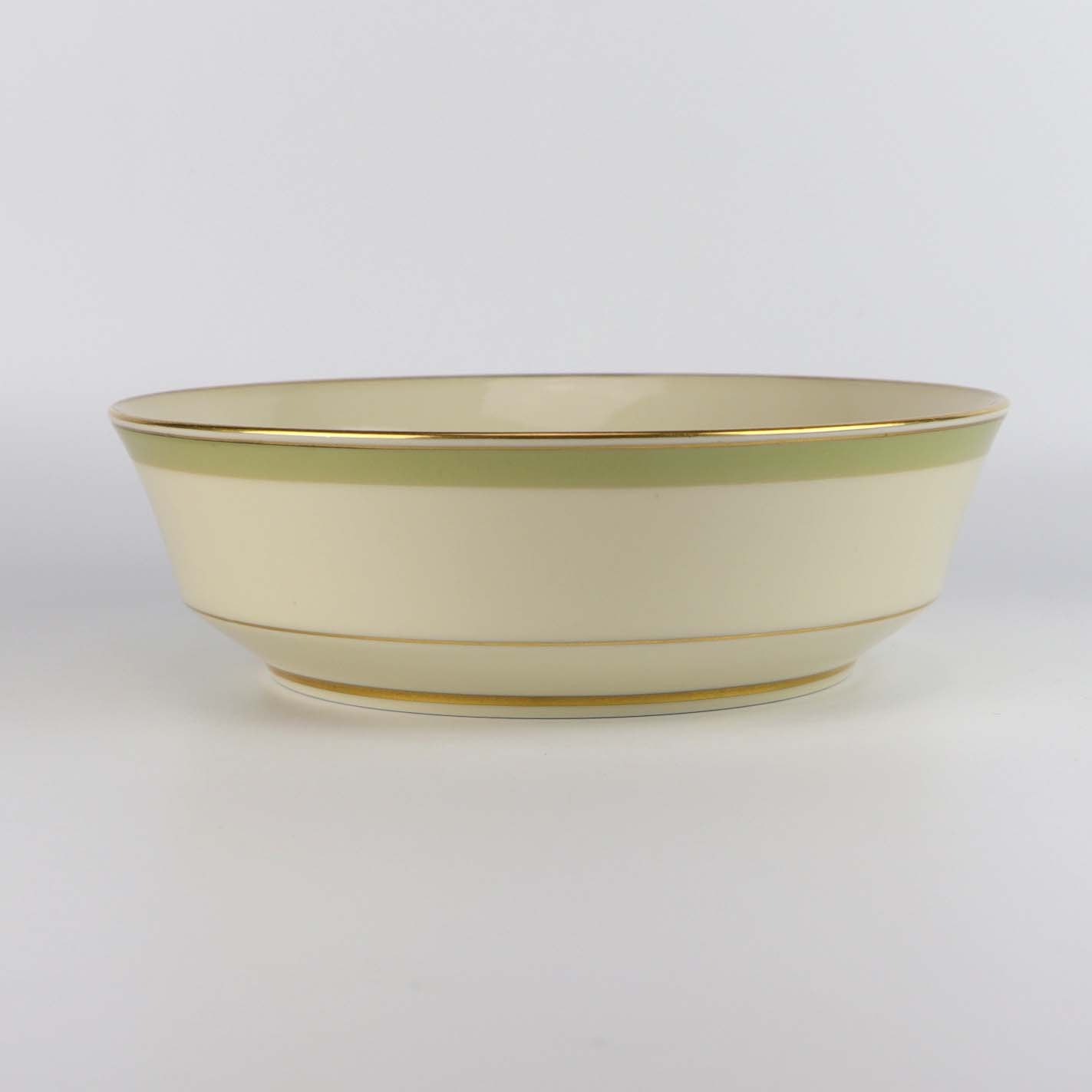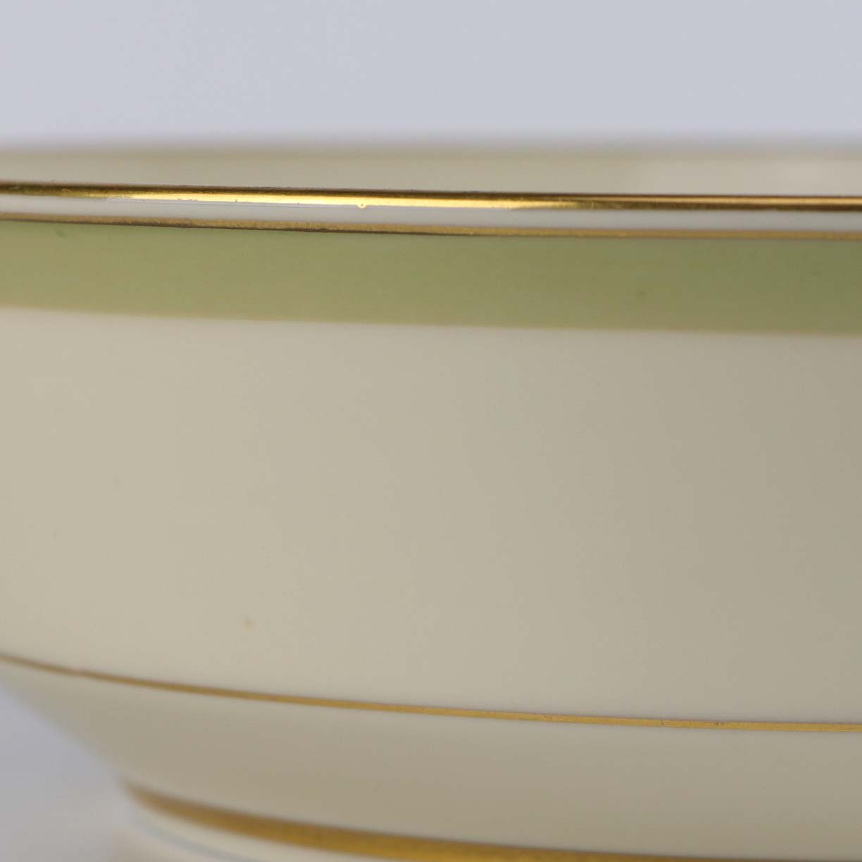 Stellet er fremstillet i glat cremefarvet porcelæn med lysegrøn dekoration og guldkant.