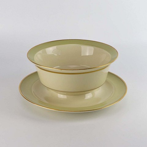 Stellet er fremstillet i glat cremefarvet porcelæn med lysegrøn dekoration og guldkant.