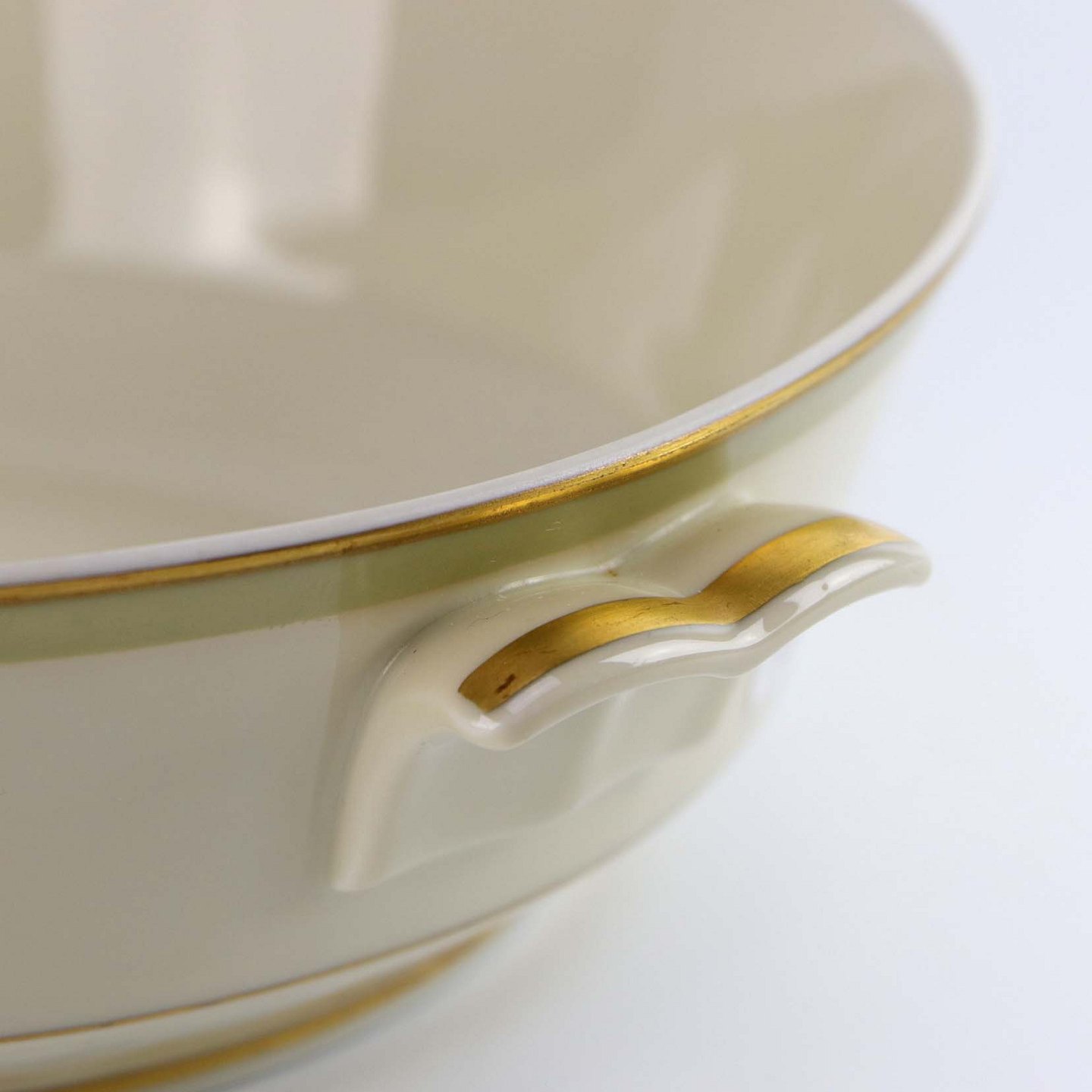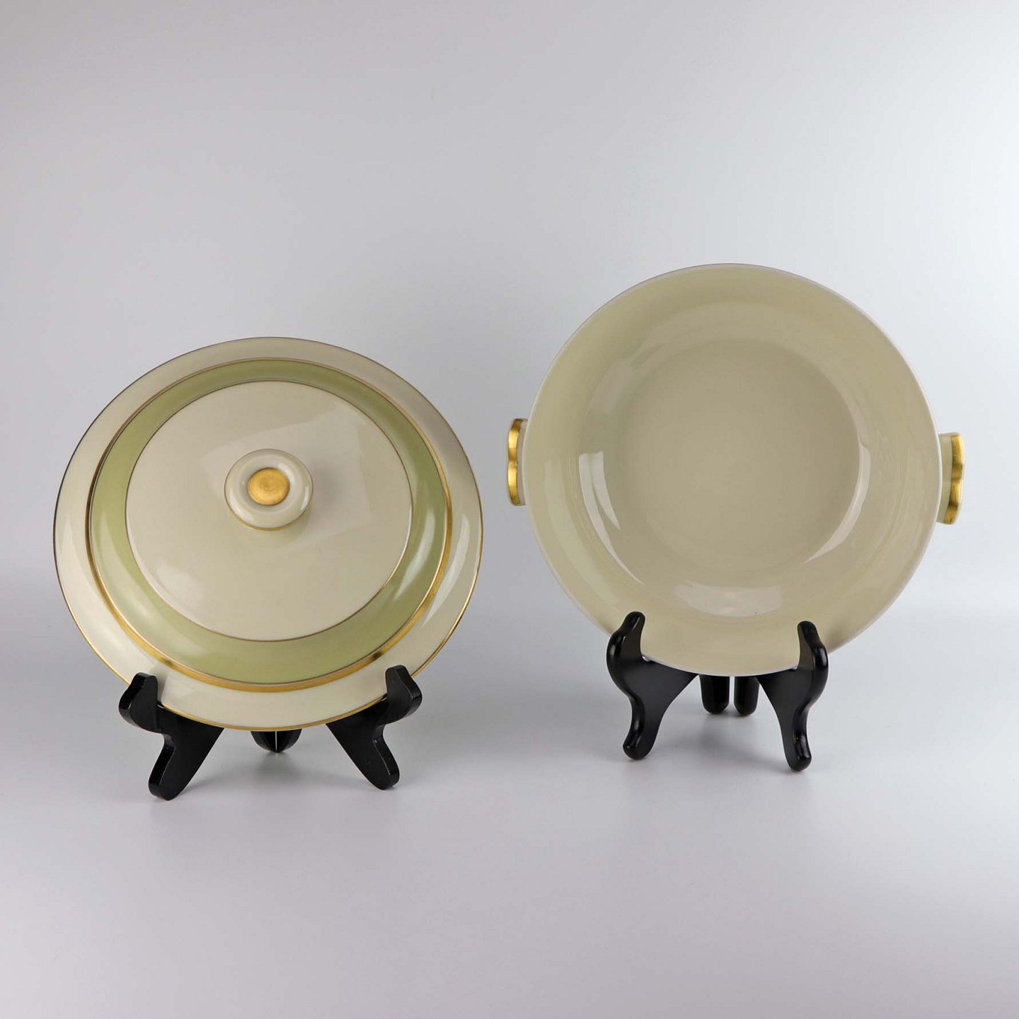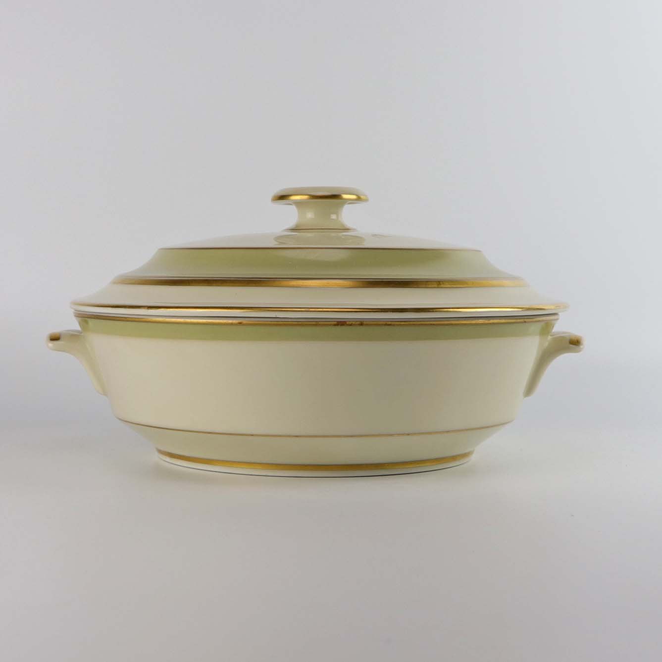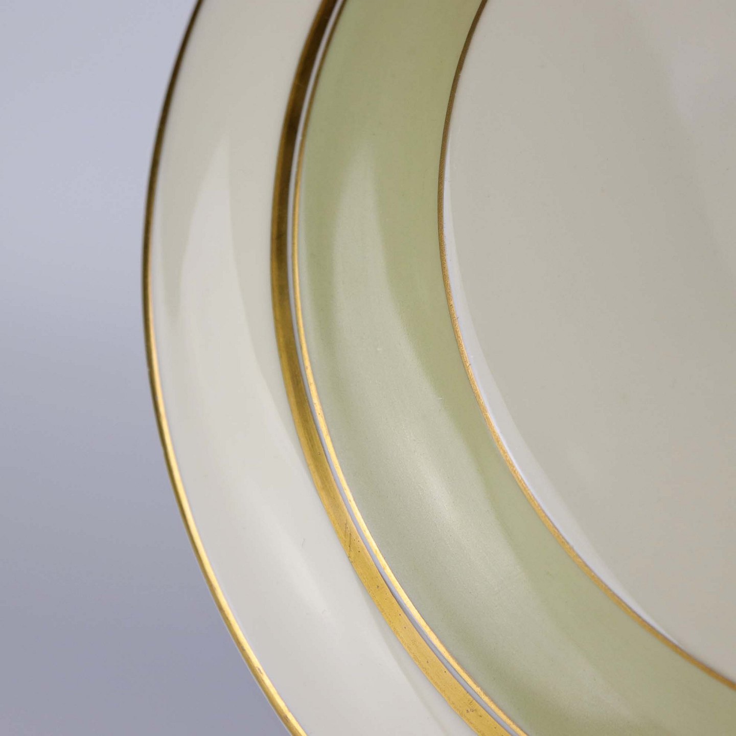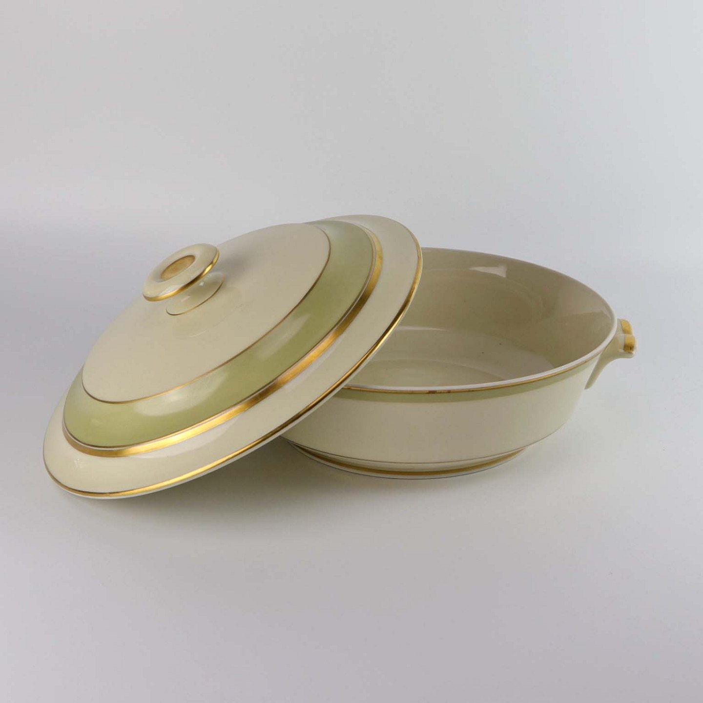 Stellet er fremstillet i glat cremefarvet porcelæn med lysegrøn dekoration og guldkant.