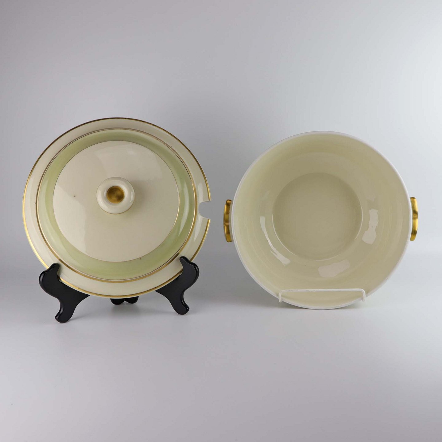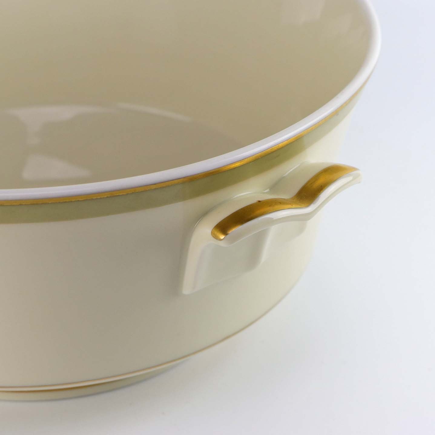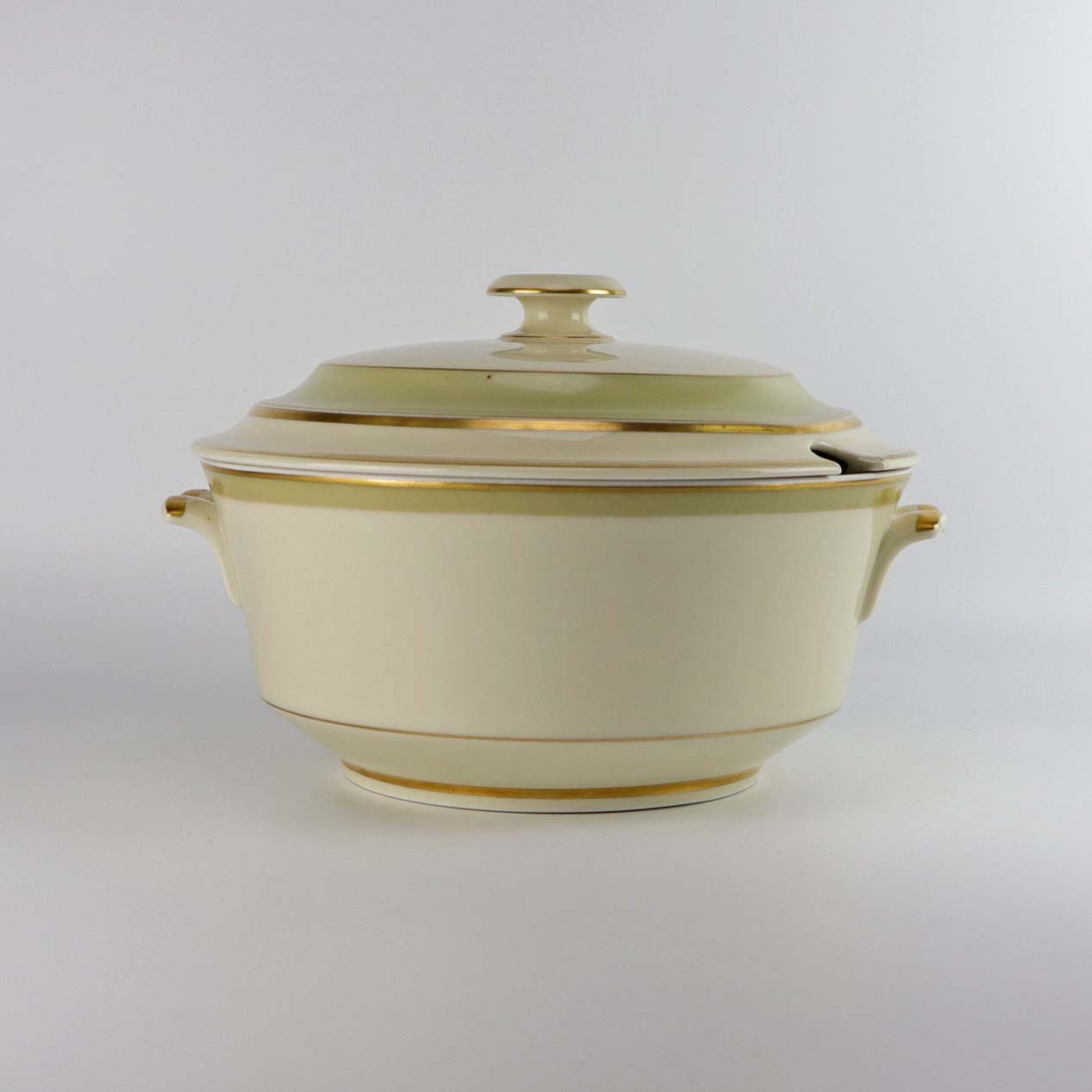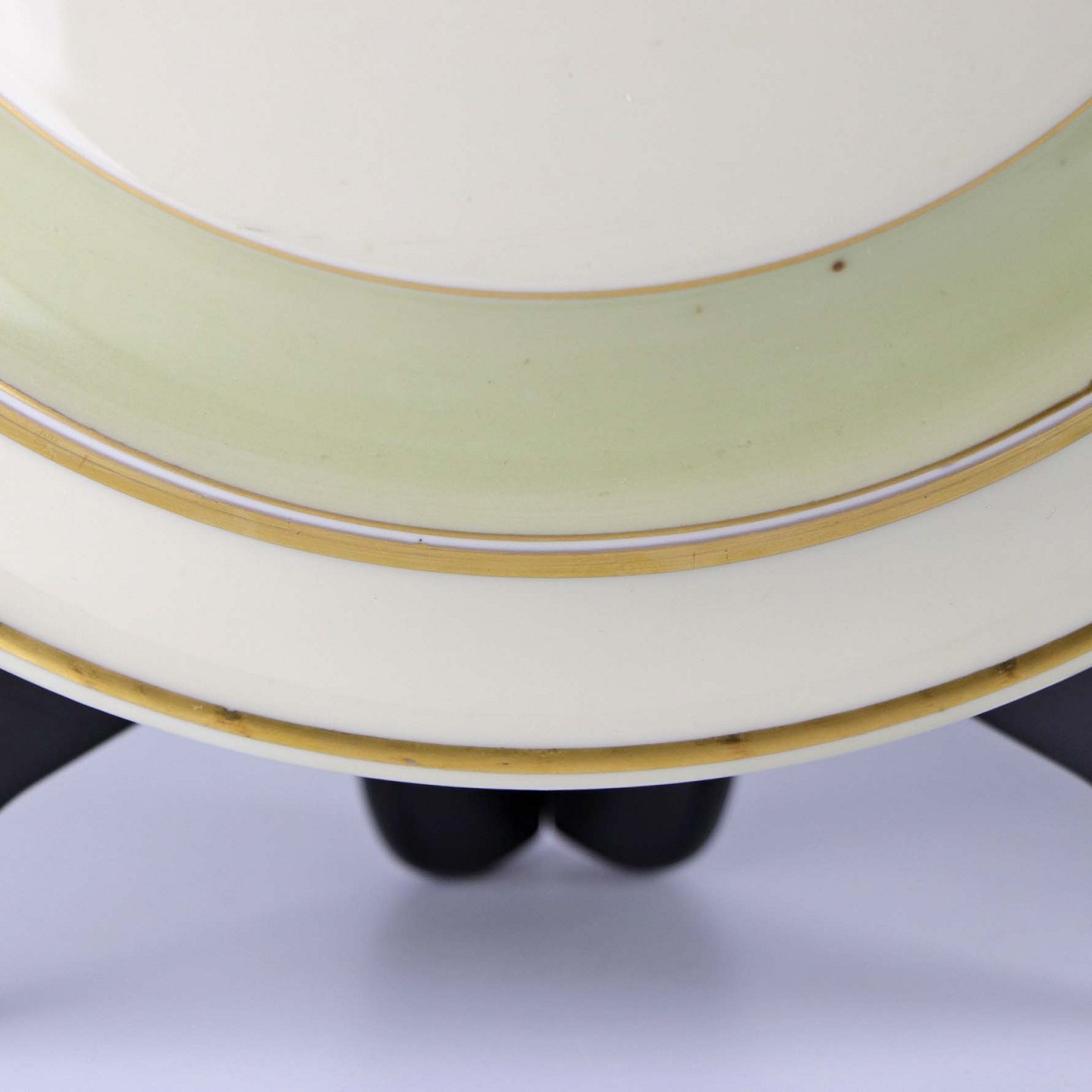 Stellet er fremstillet i glat cremefarvet porcelæn med lysegrøn dekoration og guldkant.
