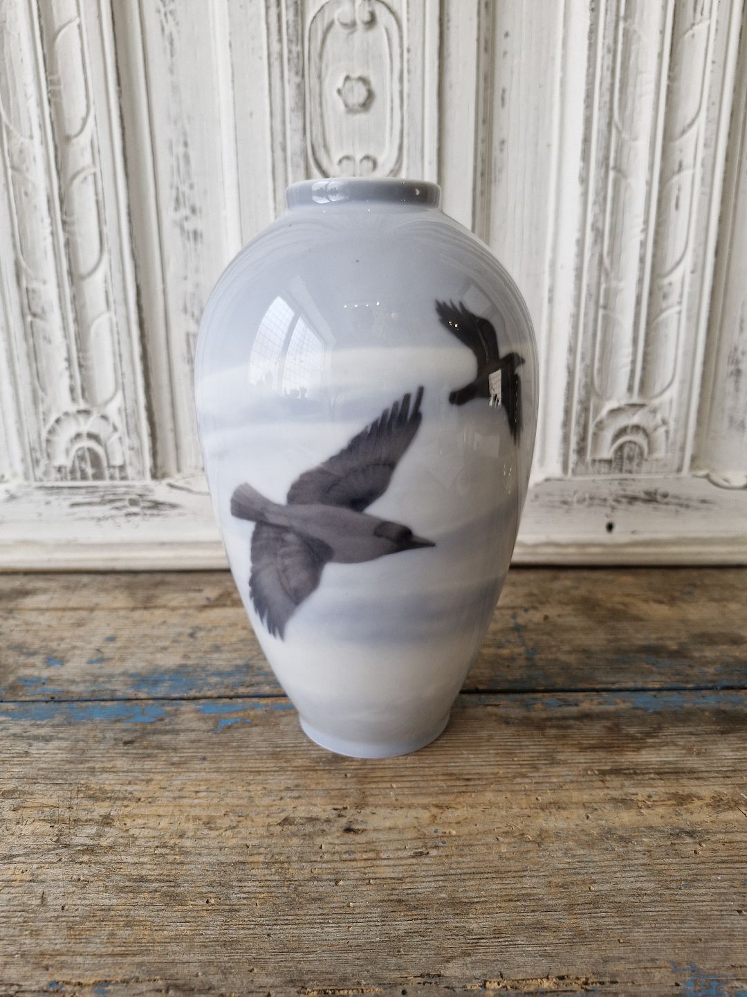 Royal Copenhagen Art Nouveau vase decorated with crows flying over a winter landscape