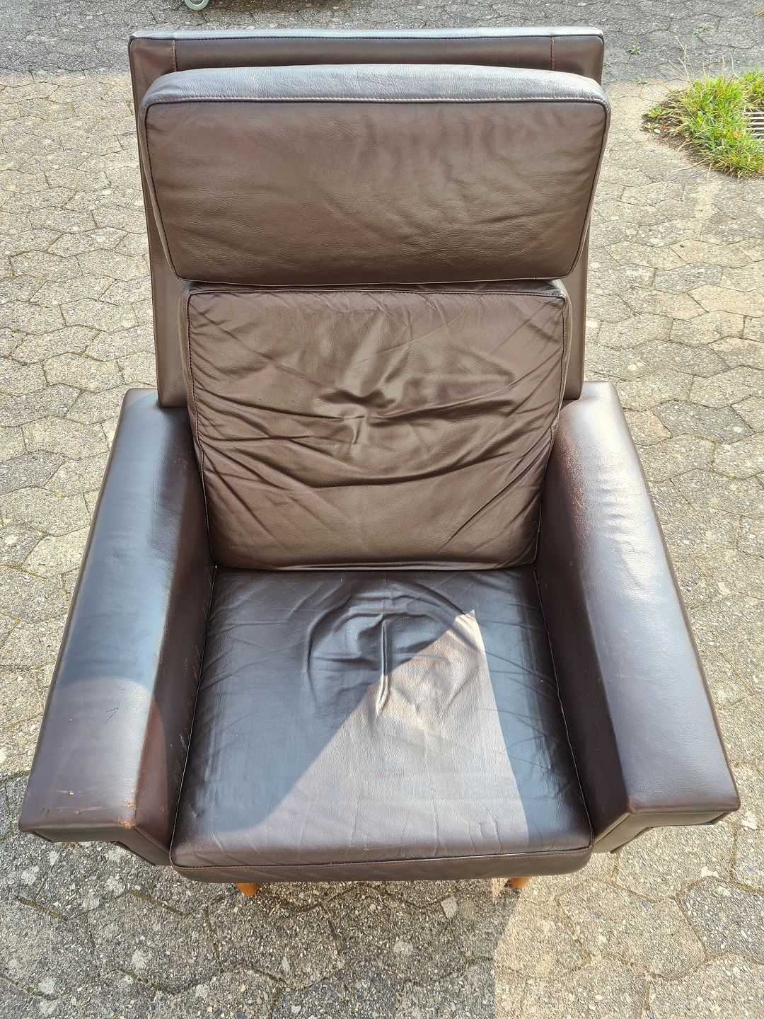Lænestol i læder med ben i teaktræ, fra 1960erne.