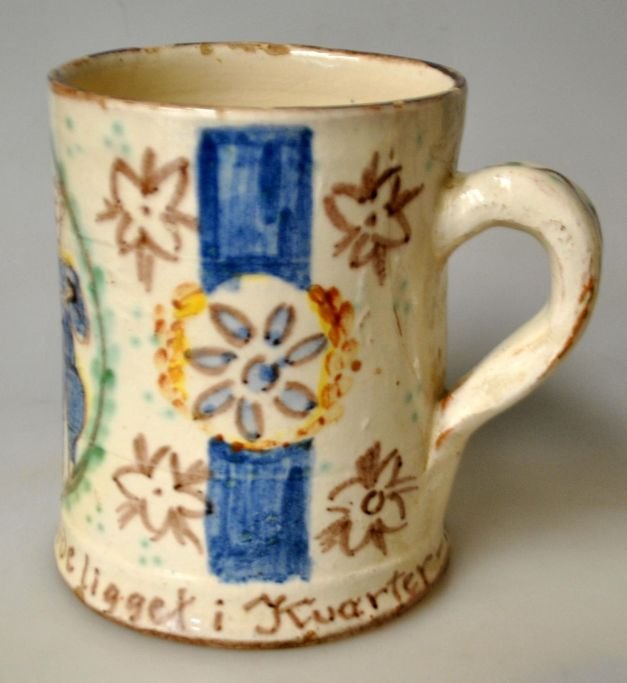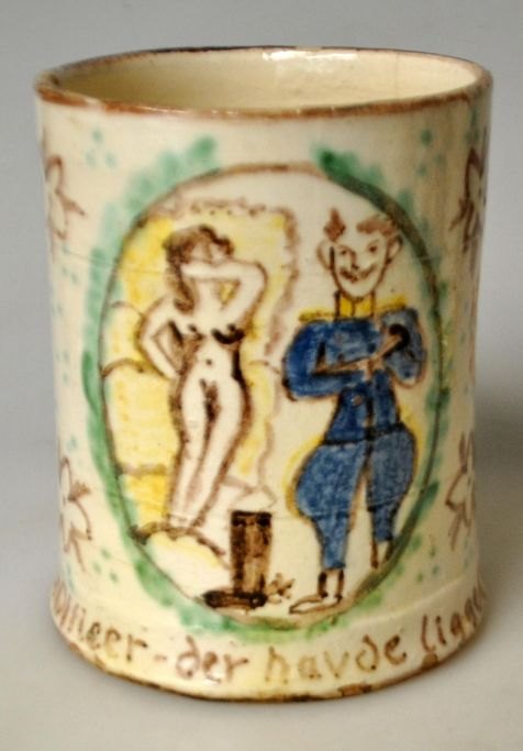 Andersen-Høyer, Kay (20. årh.) /Anders Høy, Danmark: Krus. Polykromt bemalet lertøj. Håndmalet dekoration i form af officer og nøgen kvinde. Med teksten: "Man talte om en Officer - der havde ligget i Kvarter". Signeret: Anders Høy 1936. H.:11,8 cm.