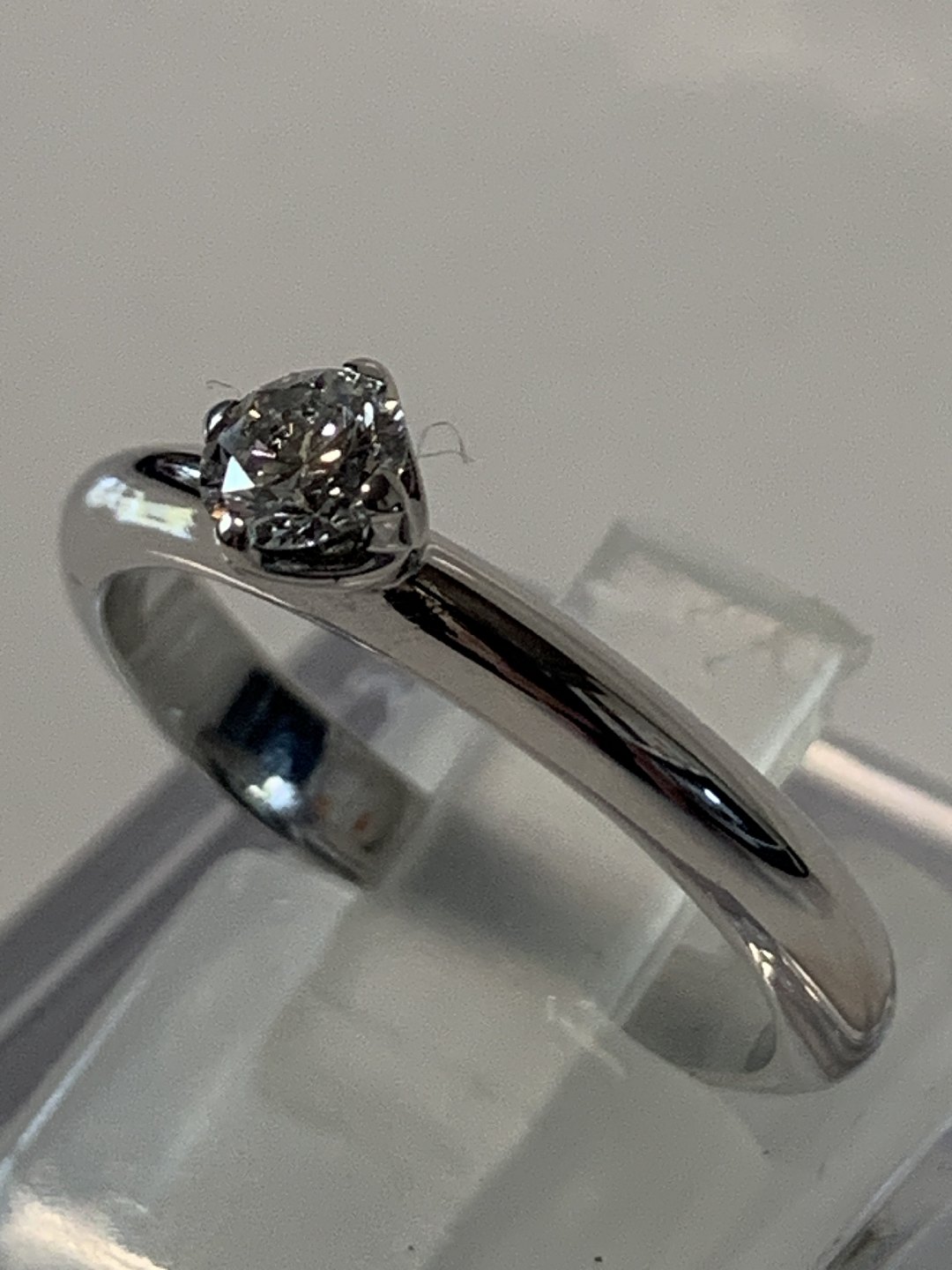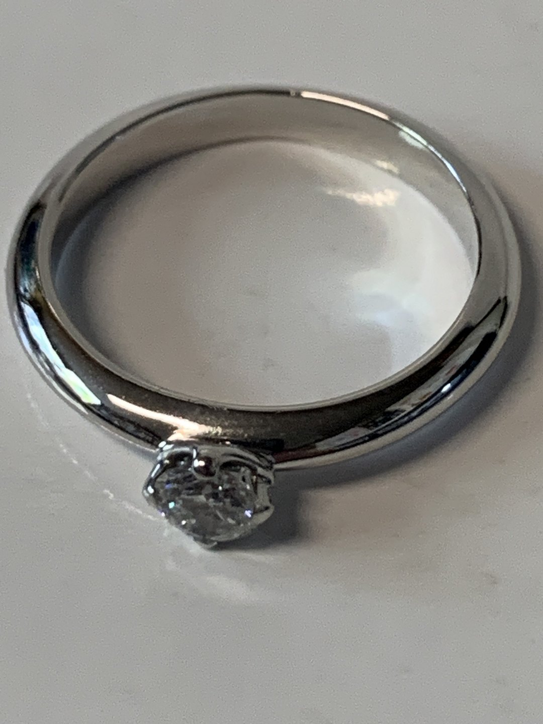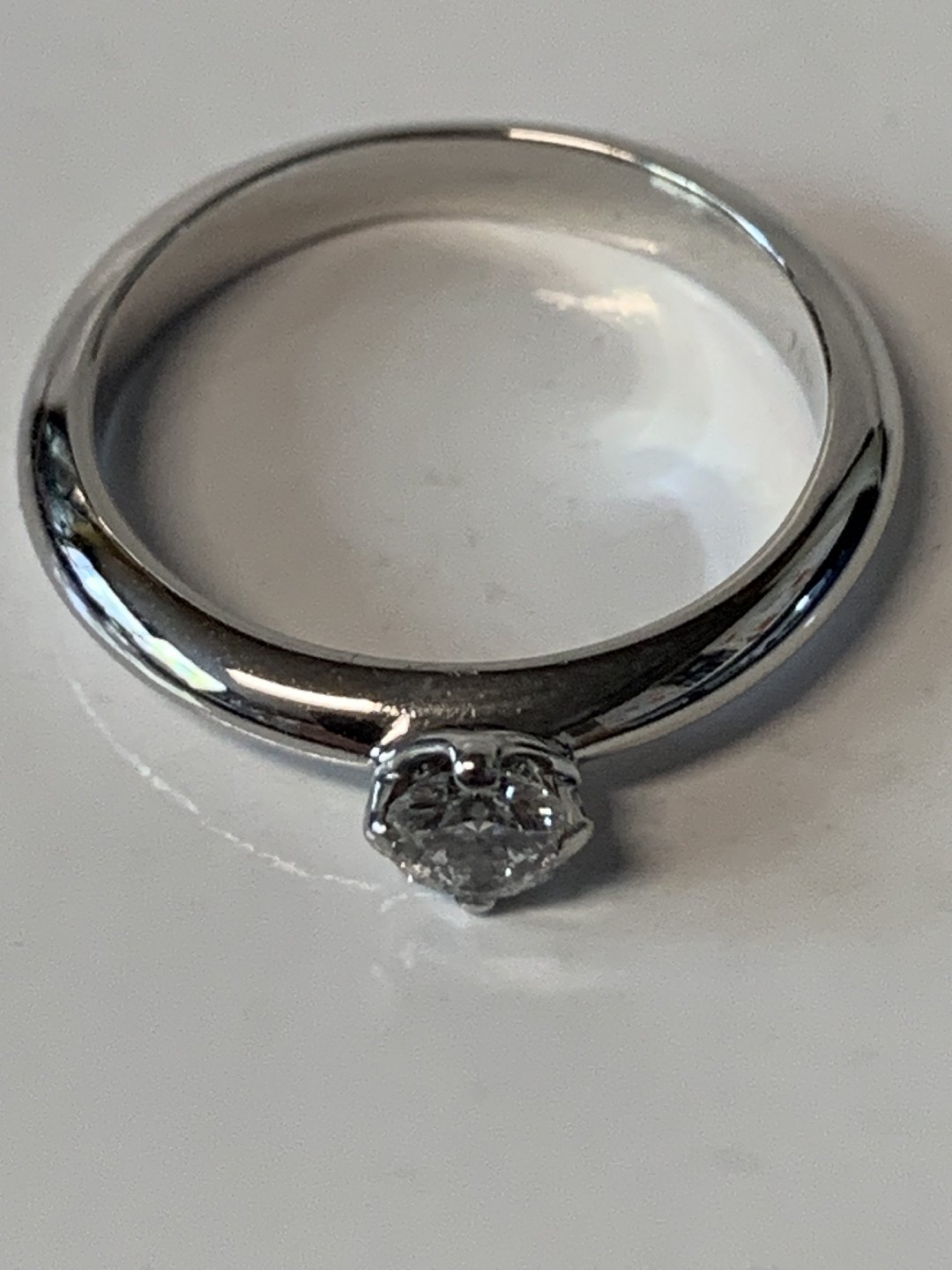 Beautiful and simple ladies' ring in 18 carat white gold, with a diamond on top. The ring is simple in its structure, which gives a minimalist, stylish look. The ring can either be worn alone or in combination with other rings.