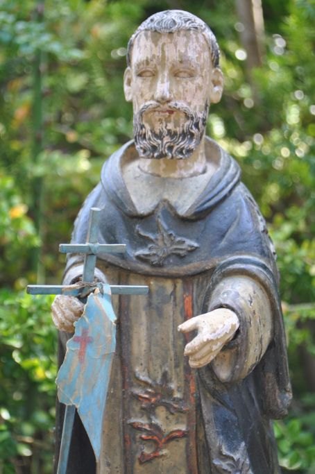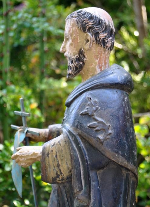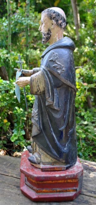 Catholic figure of a saint - a monk, 19th century Carved painted wood. With gilding. In his hand he holds a flag. On a red painted base. H. 42.5 cm.