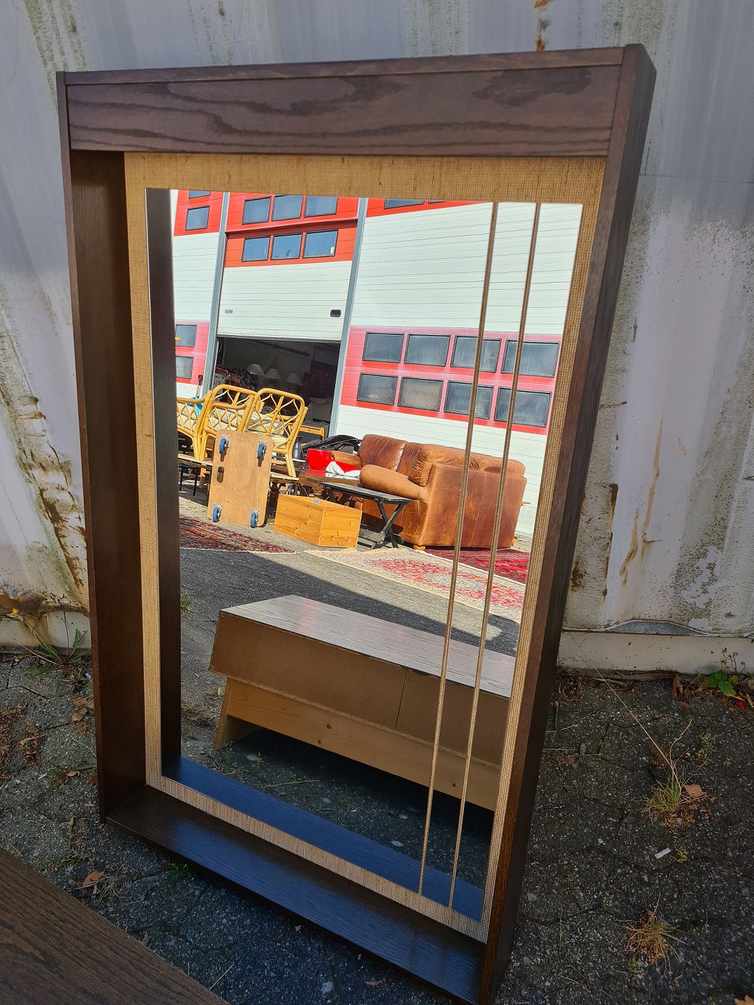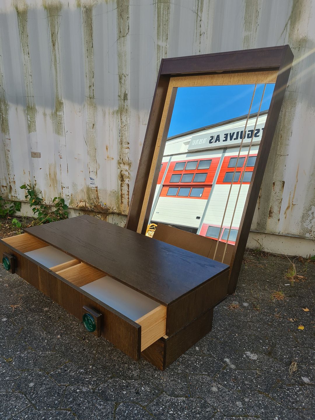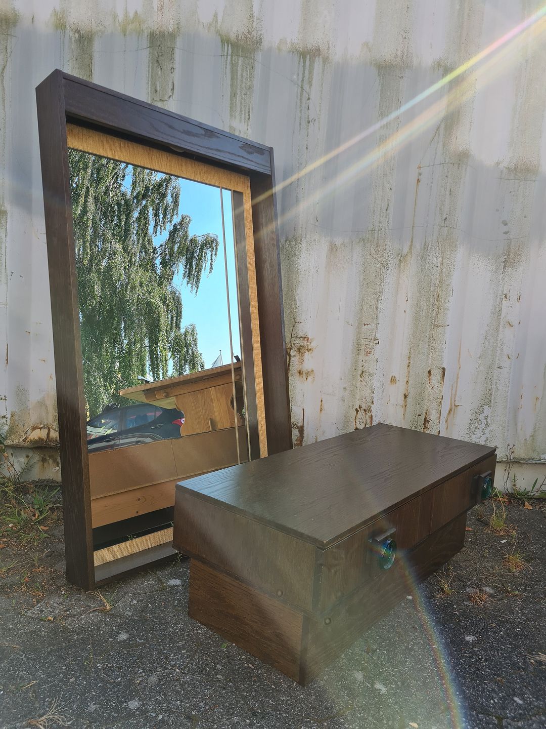 Spejl og konsol i fineret egetræ og hessian, fra 1980erne.
