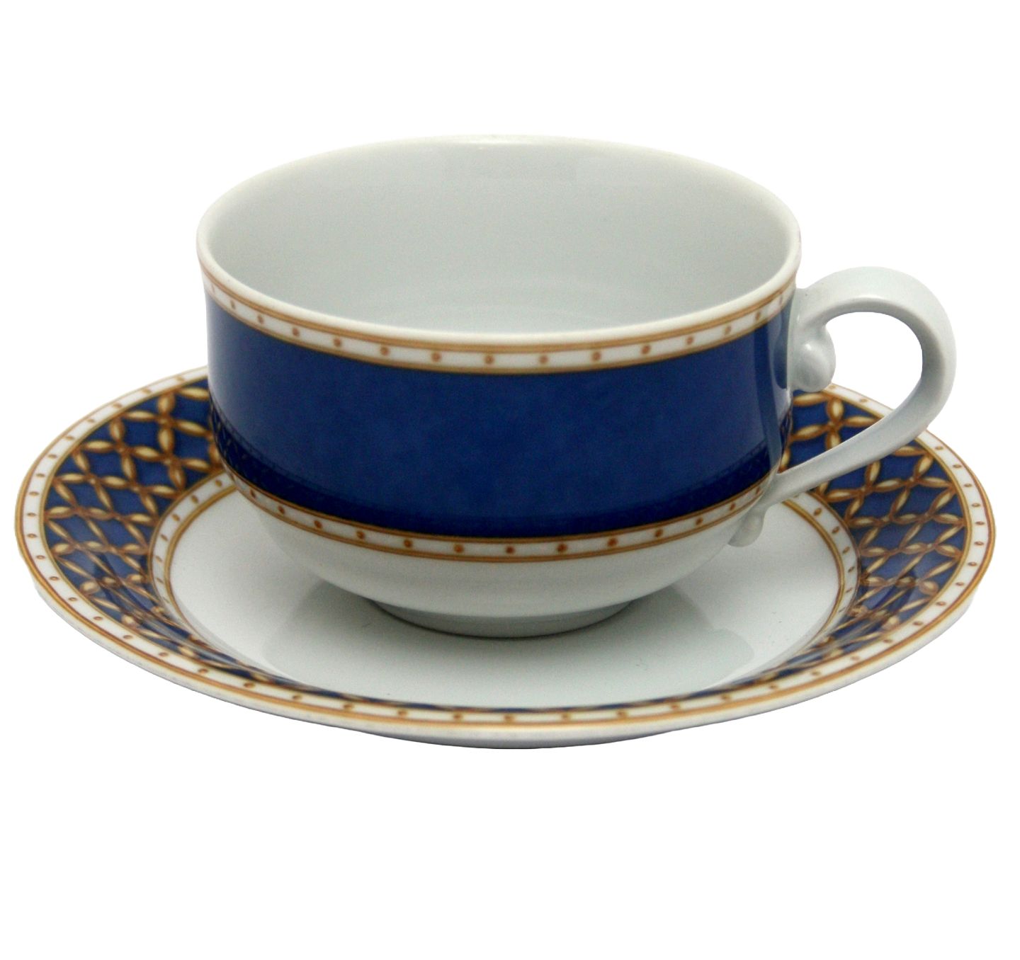 Tekop. Kongeblå med guld. Nr. 081. Højde 5,5 cm. Diameter 8,5 cm. Underkop Nr. 073 kongeblå med ternet guld diameter 14,5 cm. I. sortering. Pris: 150 kr. stk. Lager: 4