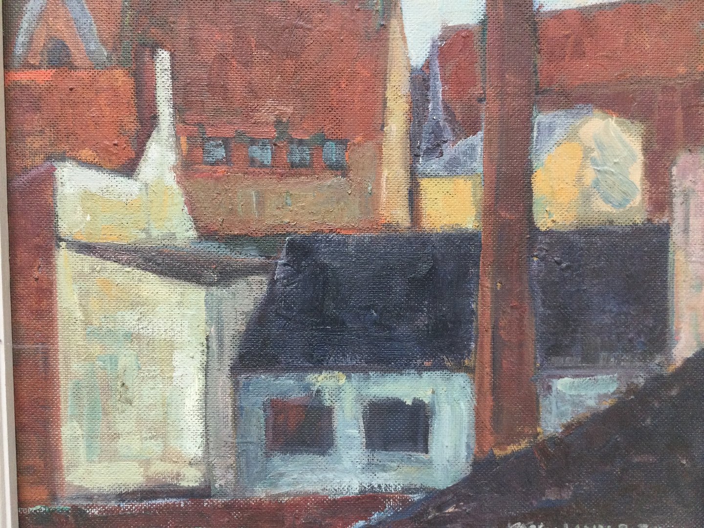 Maleri af Karin Lanng - Huse og skorsten 1980.