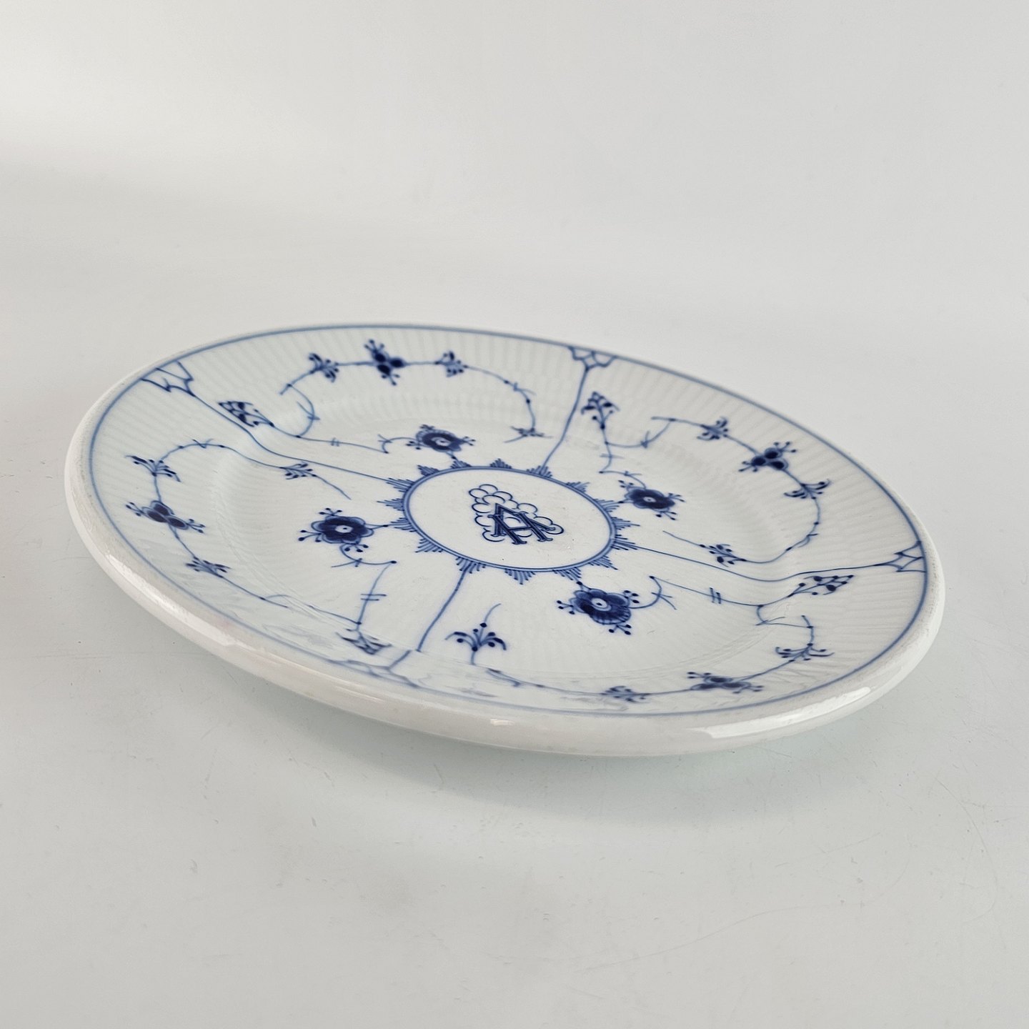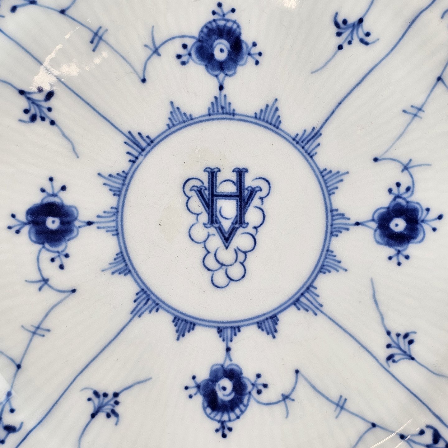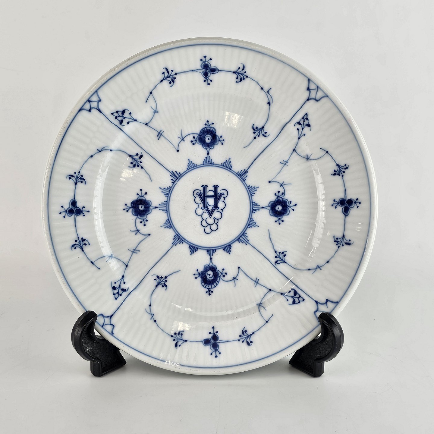 Desserttallerken i hotelporcelæn fra stellet Blåmalet nr. 2005. Tallerknen er prydet med monogrammet HV og er fremstillet med riflet mønster.