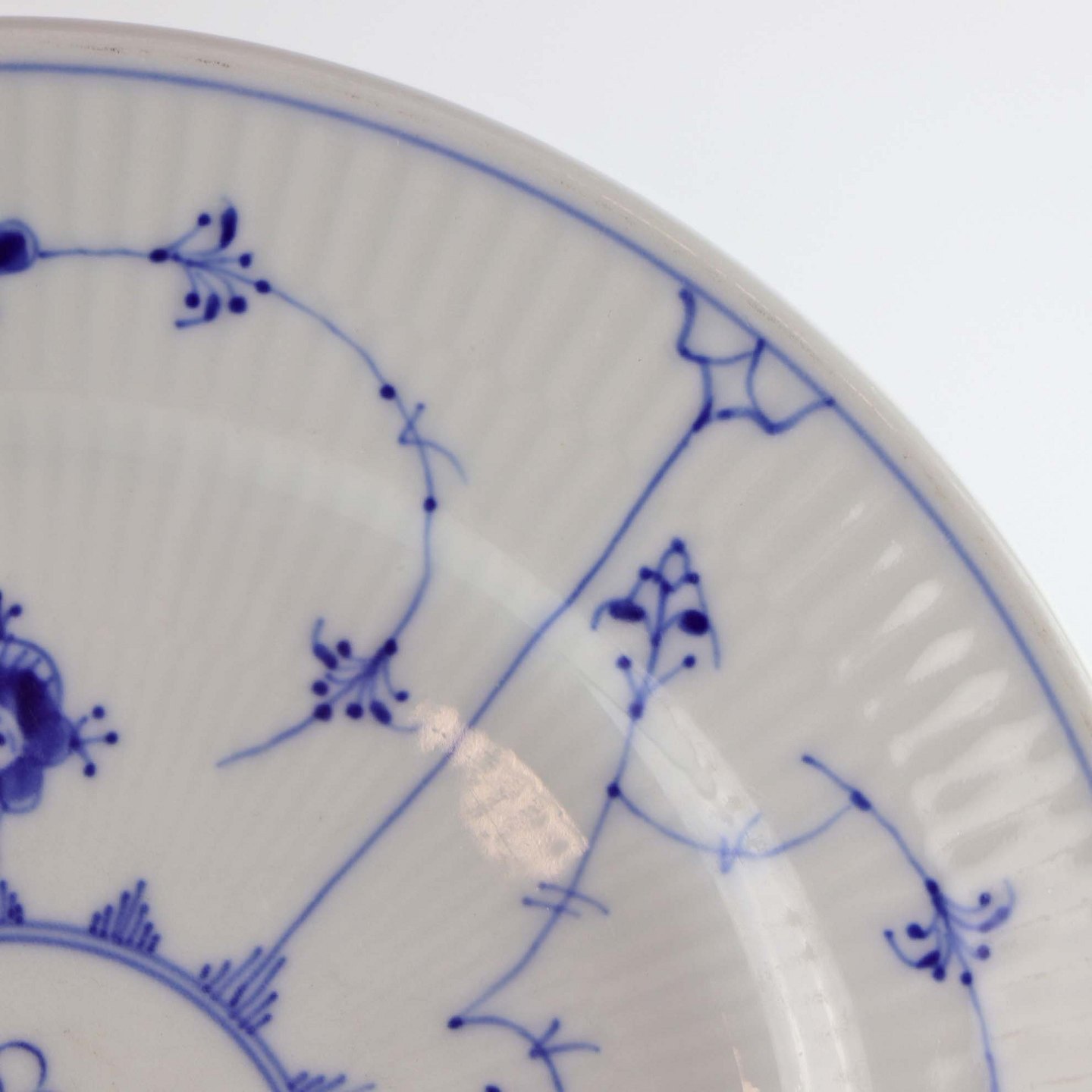 Blåmalet er i kraftigt hvidt porcelæn med skælform - her er det med riflet form - dekoreret med blå ranker og blomster. Hotelporcelæn er kendetegnet ved sit tykkere og mere holdbare udseende. Produktionen af jernporcelæn startede i ca. 1900 og senere igen 1930'erne. Stellet er restaurationsservice og er produceret til bland andet skoler, restauranter og hoteller.