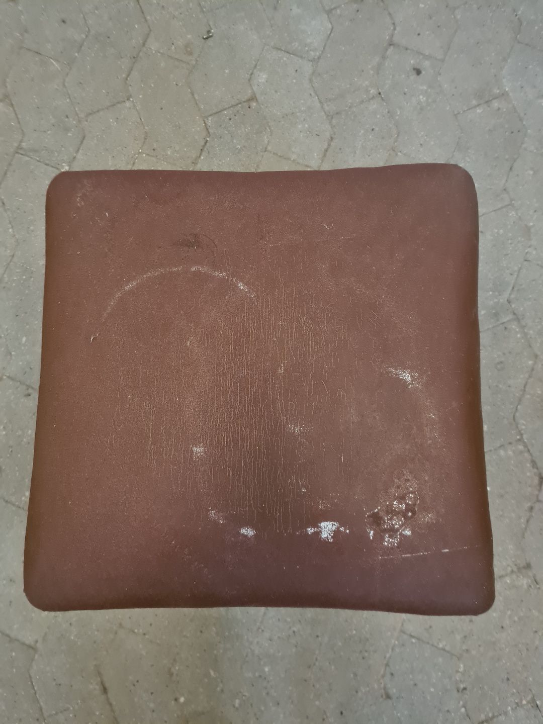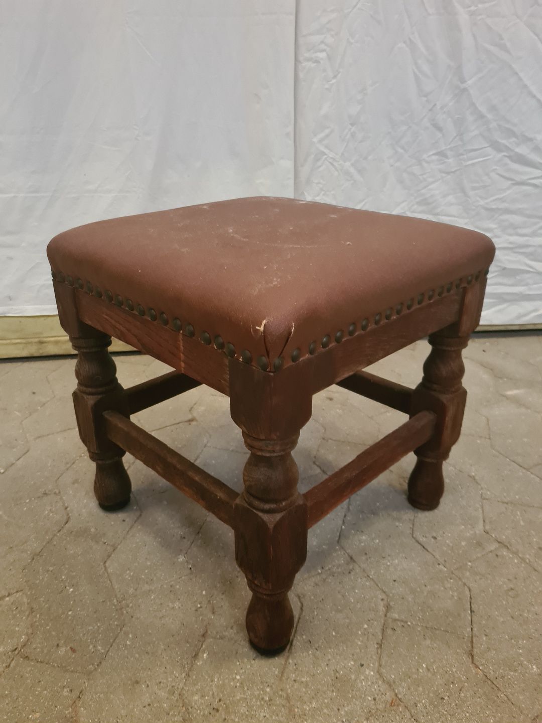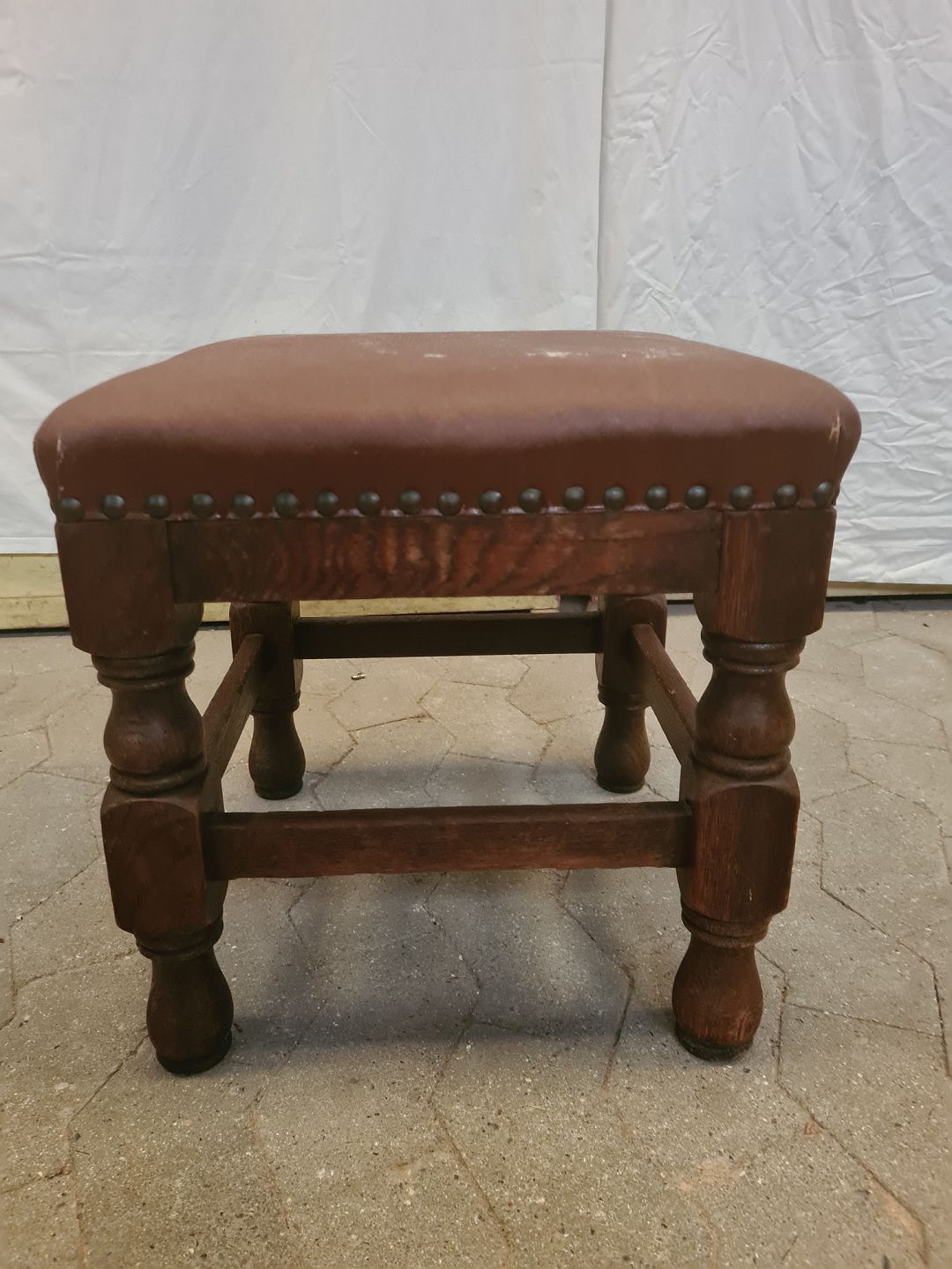 Skammel i massivt egetræ med kunststofbetræk, fra 1930erne.