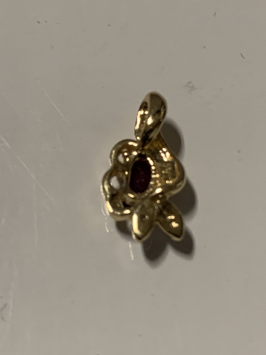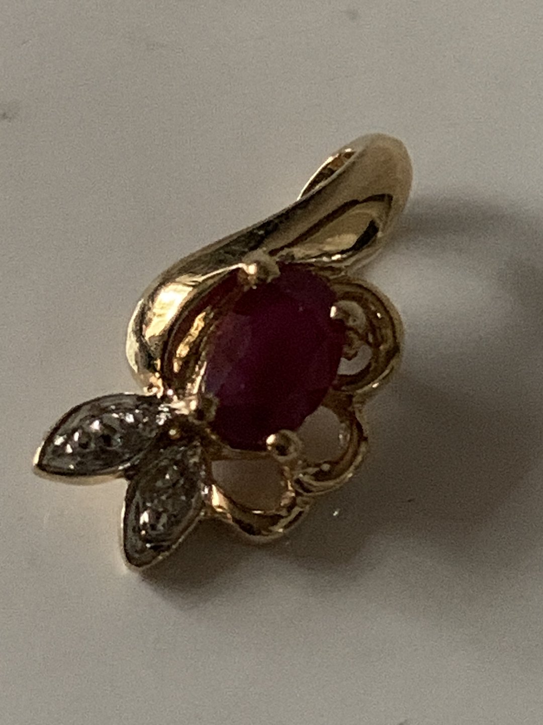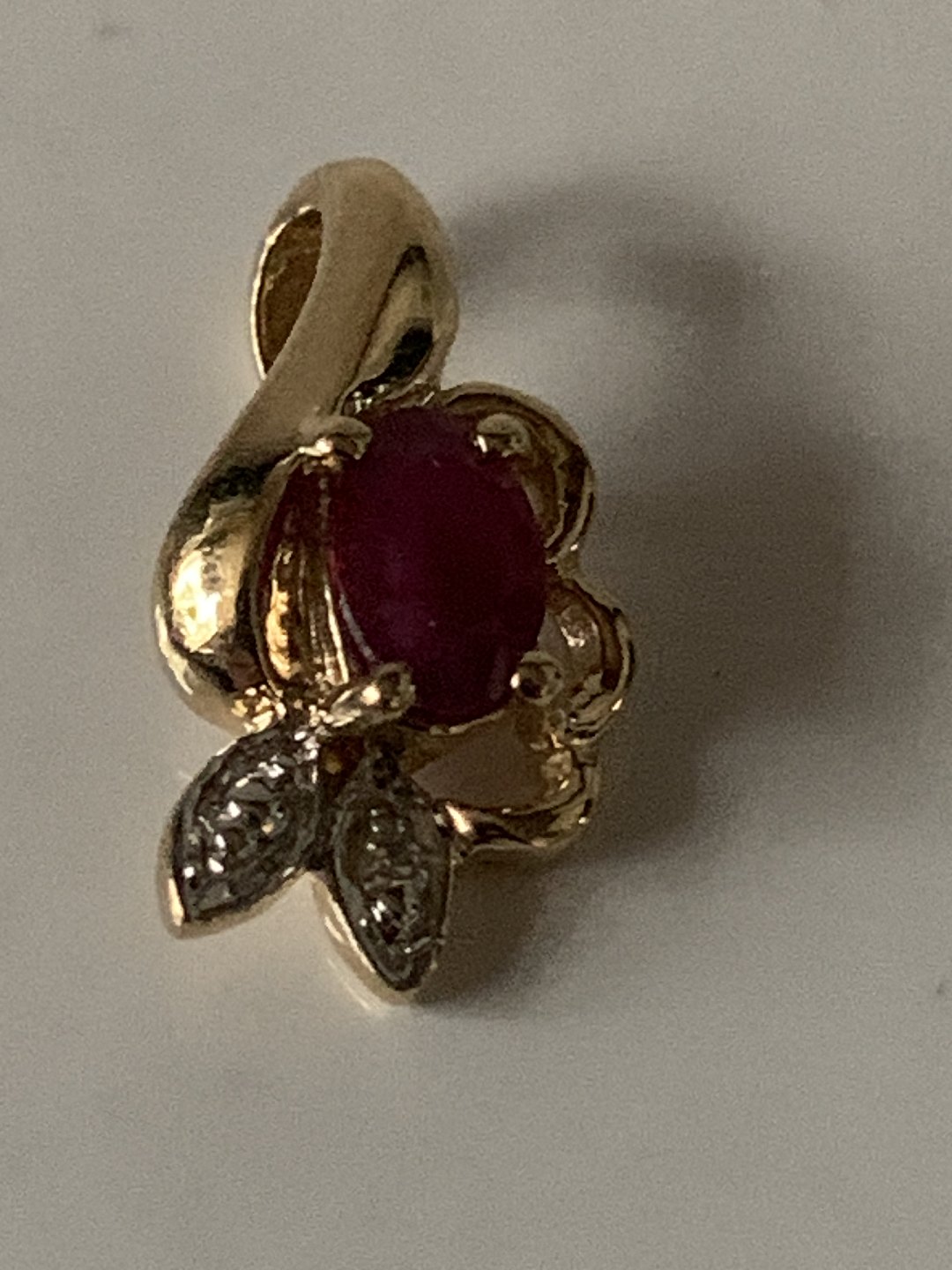 Vedhæng 14 karat guld, med en rød rubin samt indlagte Diamanter.