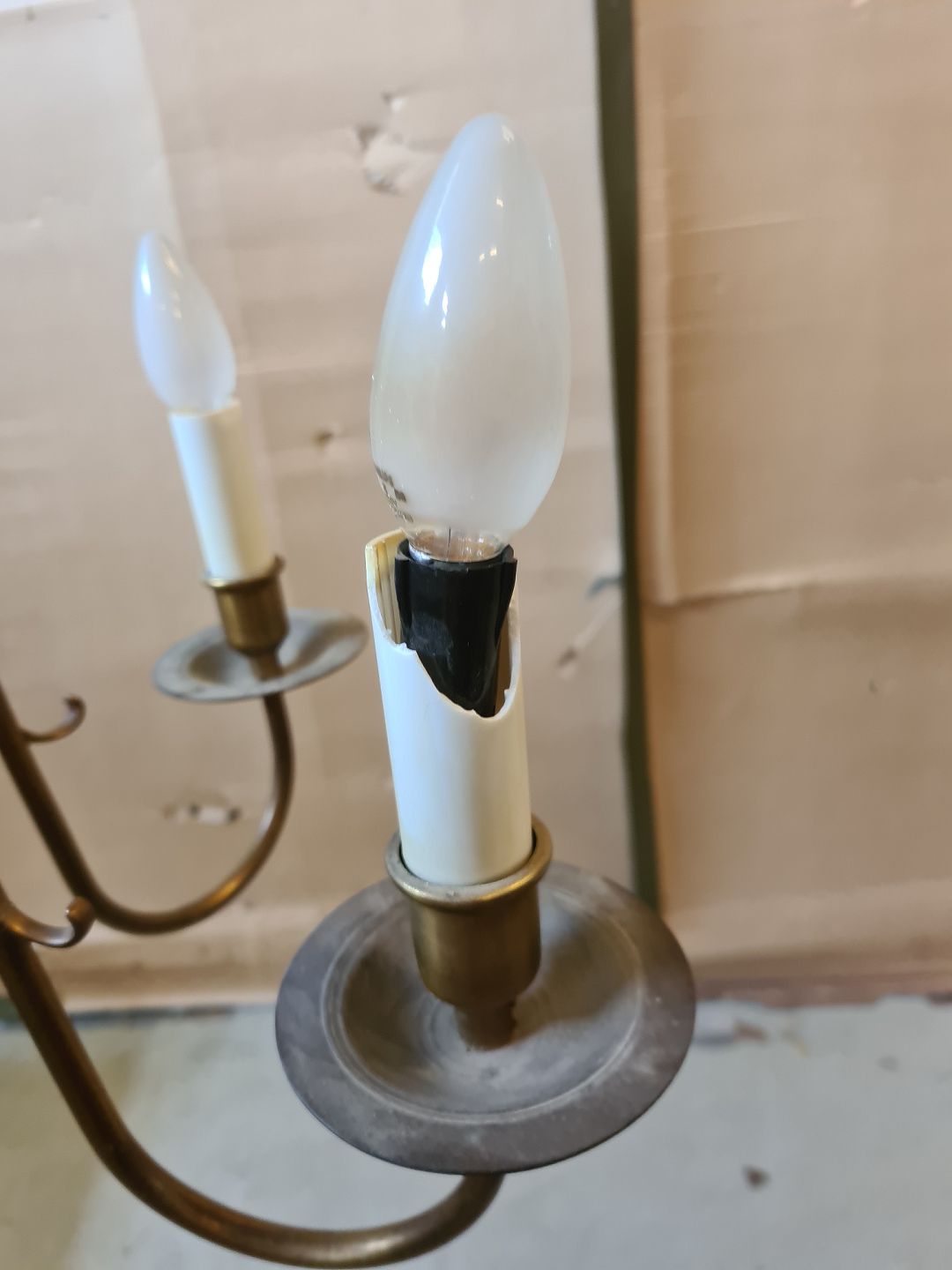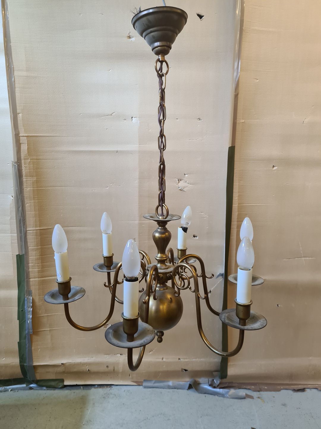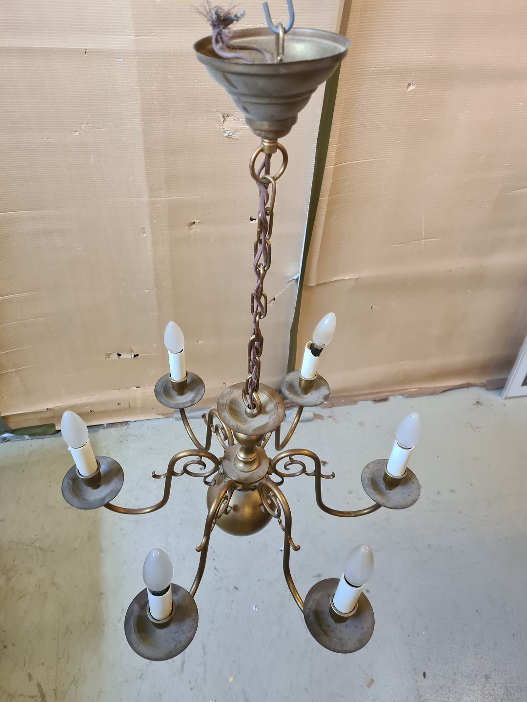 Kirkekrone med 6 arme i messing, fra 1930erne.