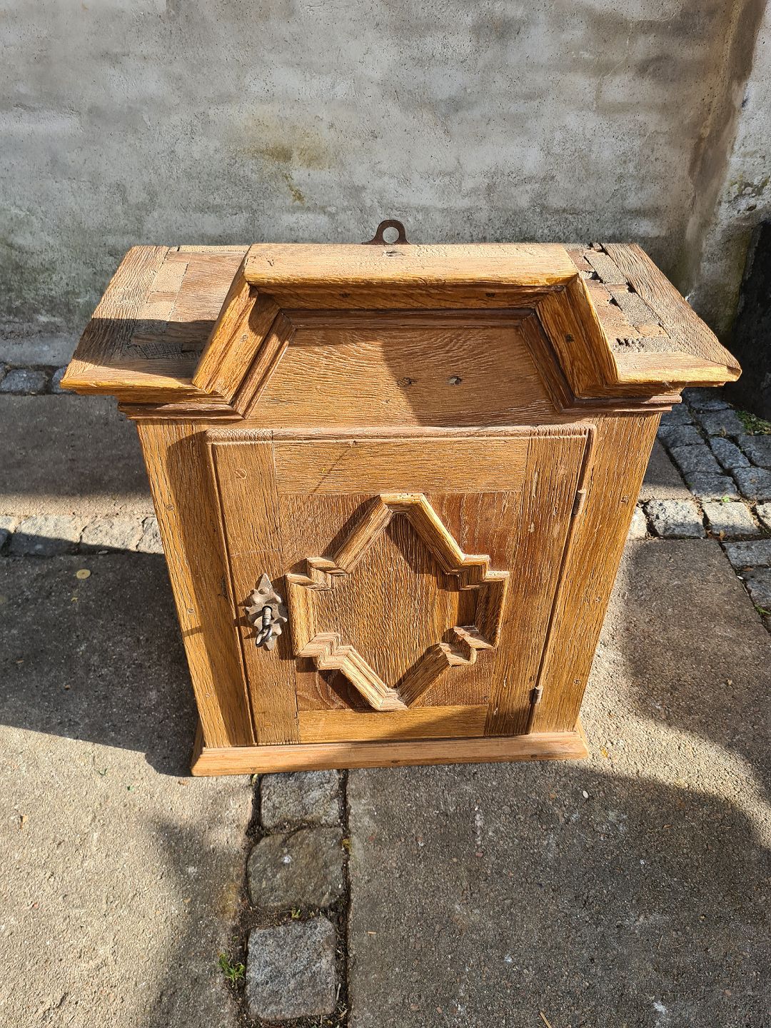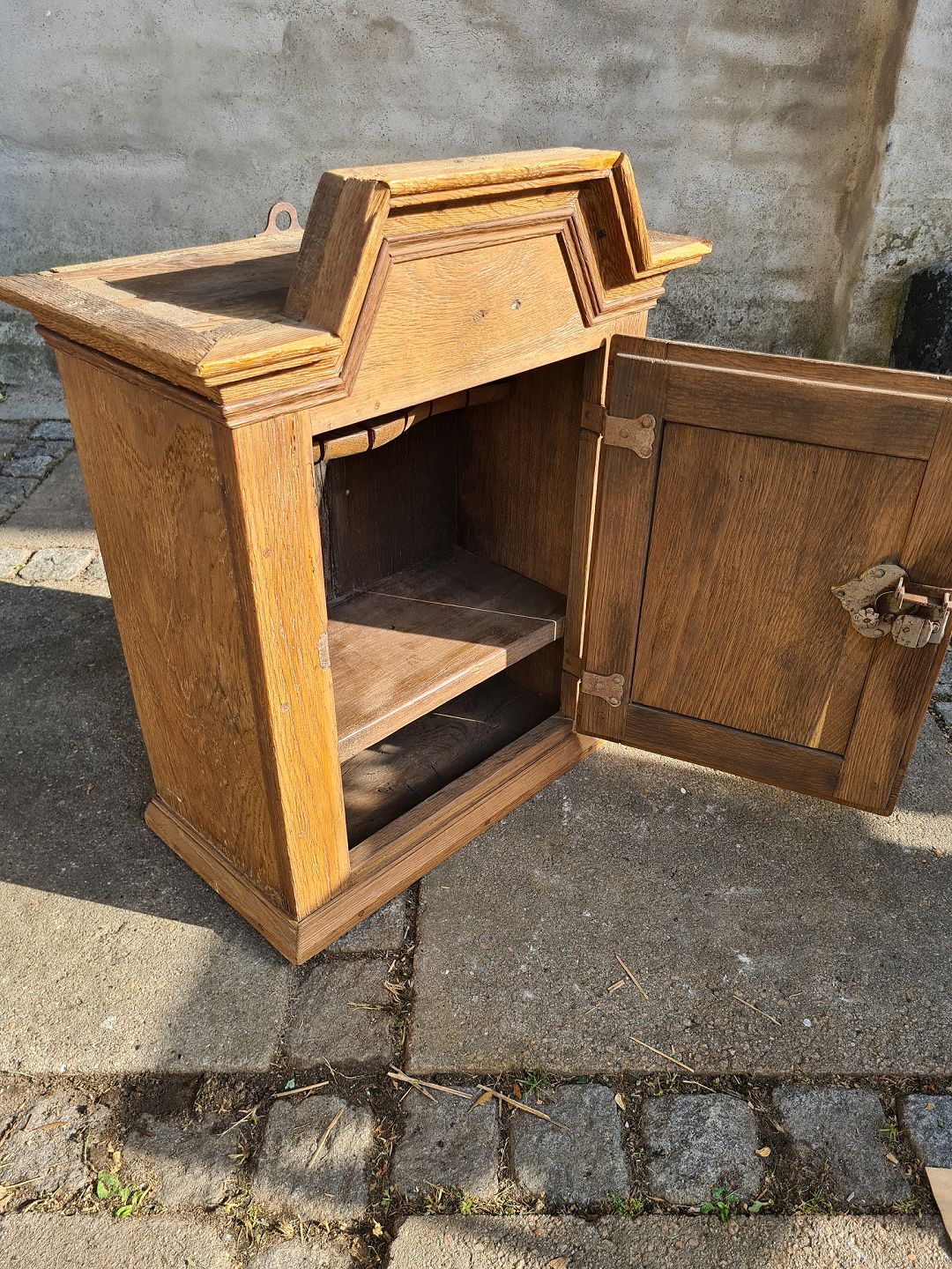 Gammelt vægskab fra 1800 tallet i eg. Fremstår pænt og gedint uden de store brugsspor.