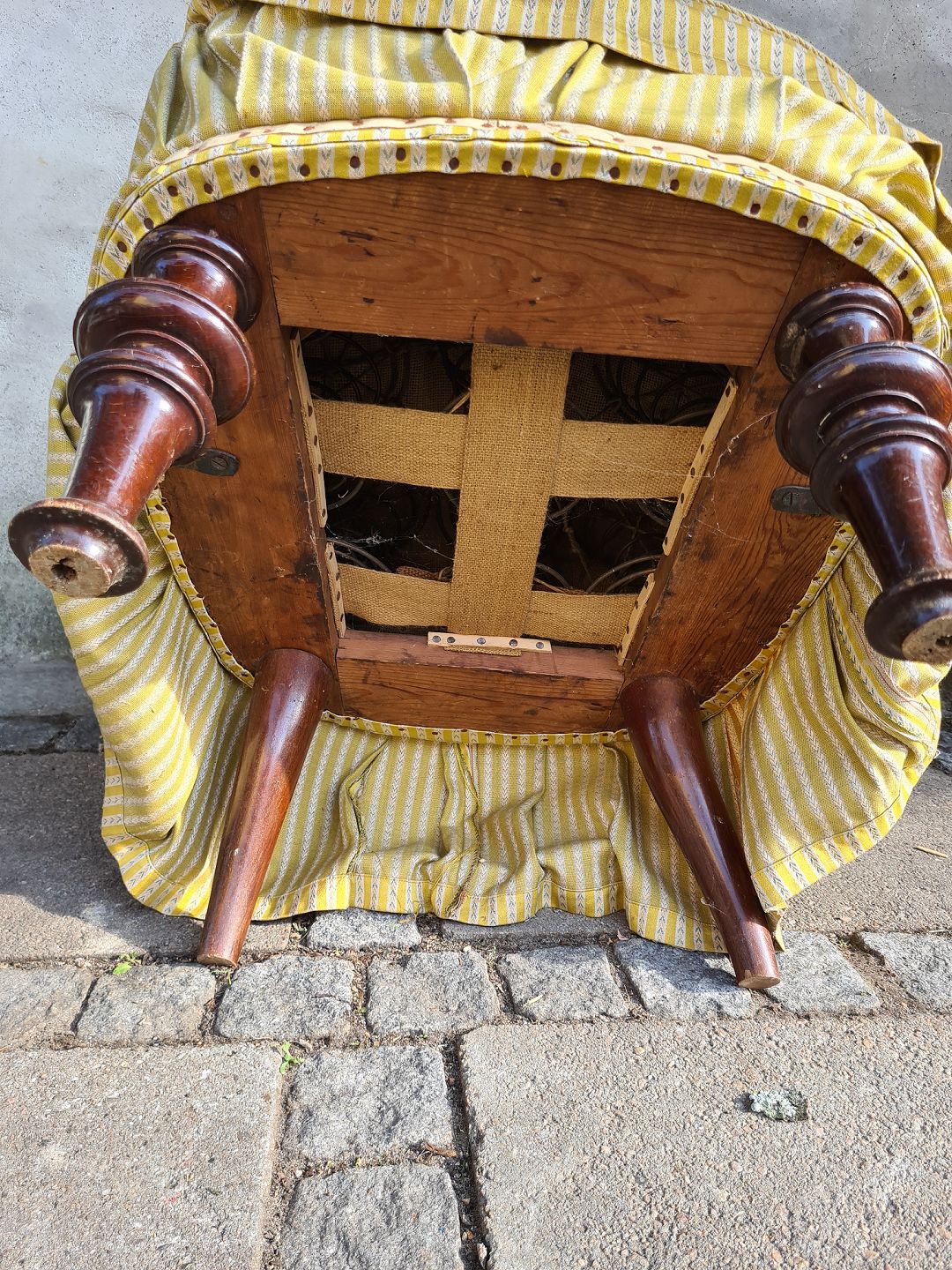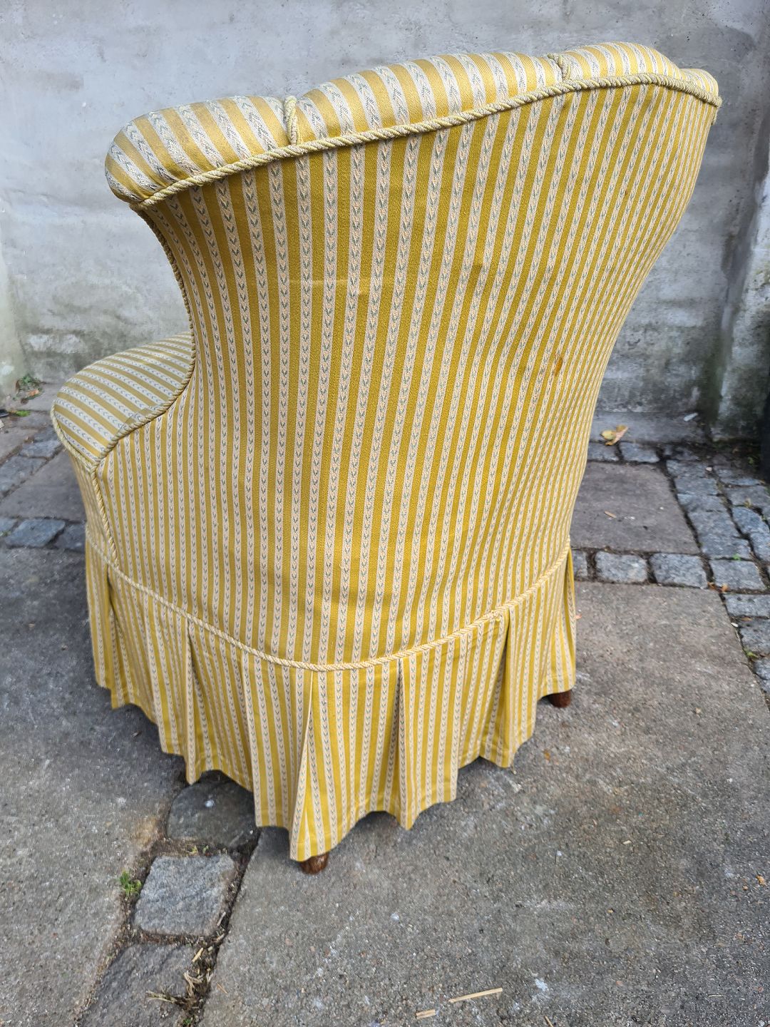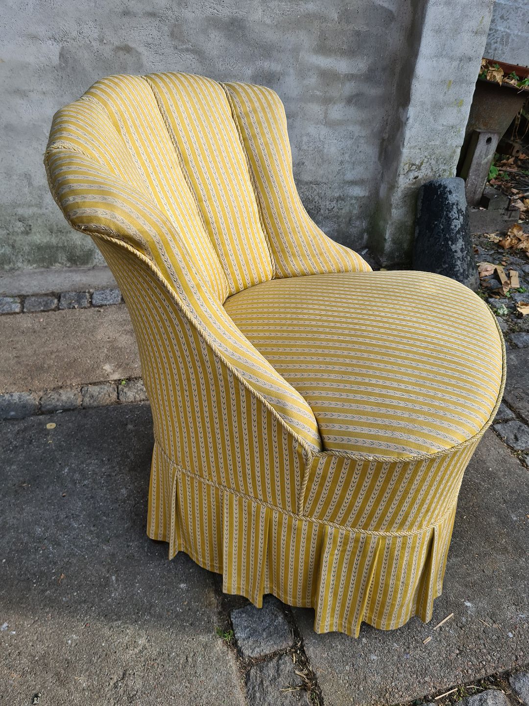 Overpolstret salonlænestol fra 1930'erne. Fremstår pæn og velholdt uden de store brugsspor på stoffet. Derudover udmærket stabil.