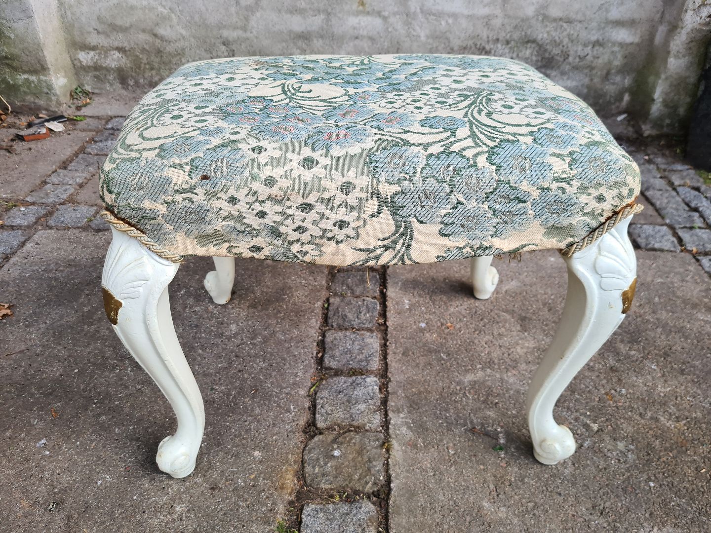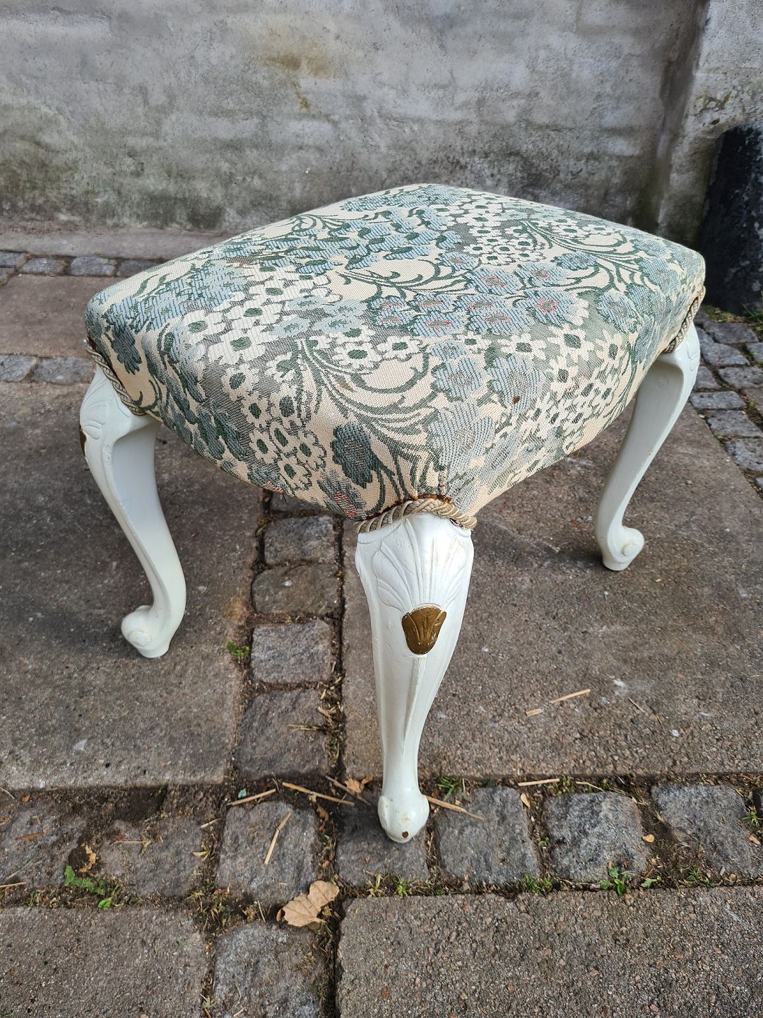 Hvidmalet taburet fra 1940'erne I rokoko stil og med polstret sæde. Fremstår pæn, velholdt og udmærket stabil.