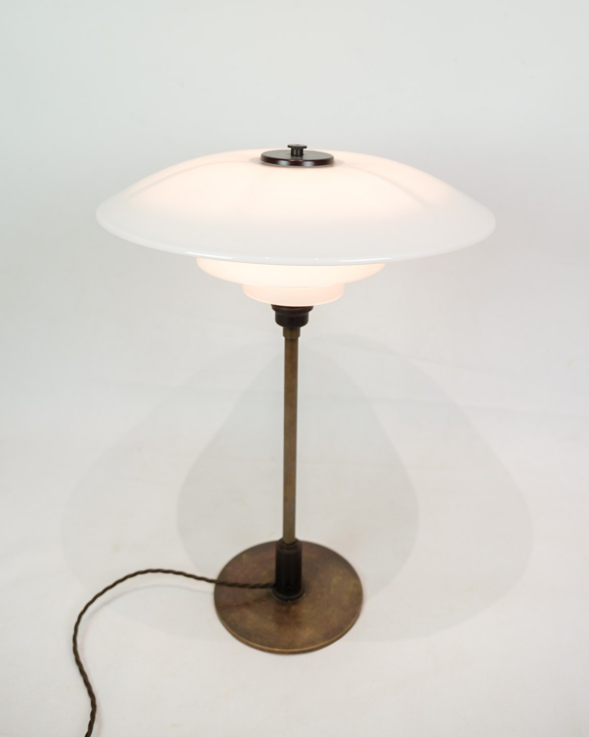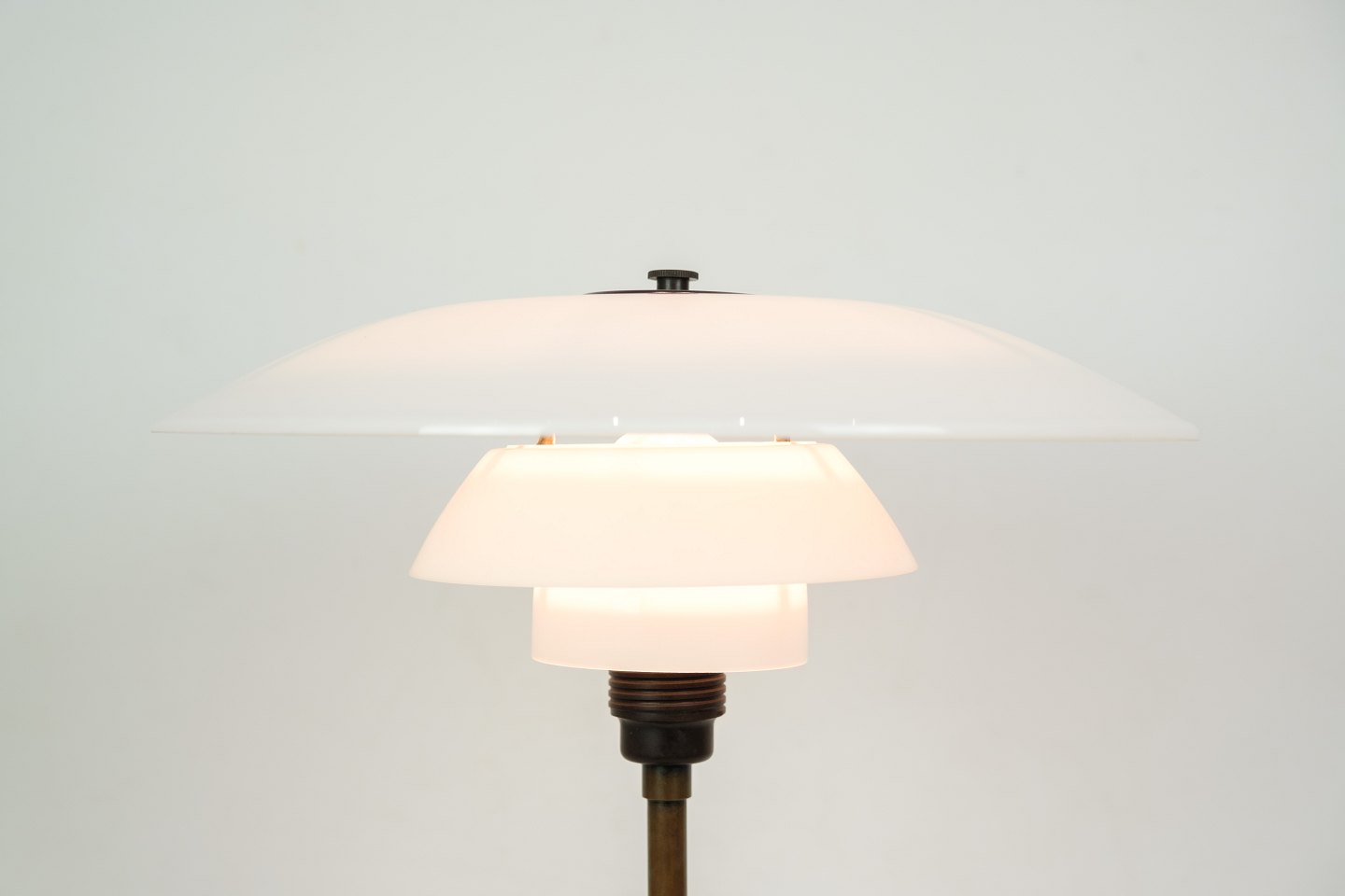 Bordlampe, PH 4/2½, designet af Poul Henningsen og fremstillet af Louis Poulsen i 1930'erne. Lampen er udført med hvide opal glasskærme og et stel af bruneret messing, som giver en klassisk kombination af funktion og elegance. PH-lamperne er kendt for deres unikke design, hvor skærmene er skabt til at sprede lyset jævnt og blødt.
