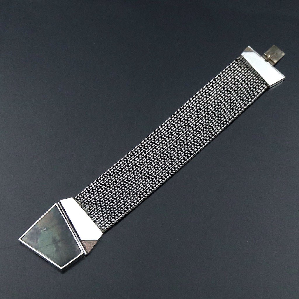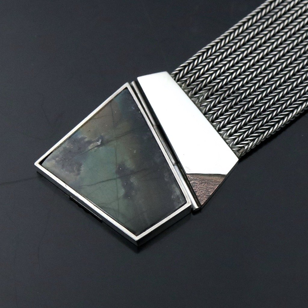 Sterling Silver Mesh Bracelet with Spectrolite, Copper details and 14k Gold lock.